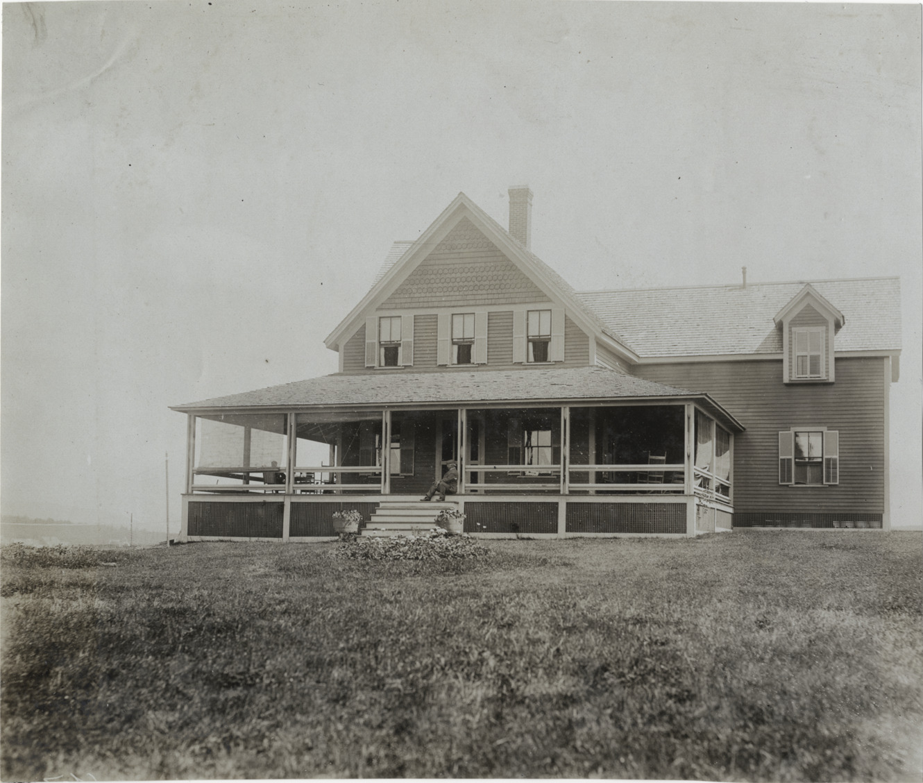 View of two-story wooden-frame house with full-length covered porch; man sits on front steps. Handwritten on back: "Architecture--Domestic, 1906."