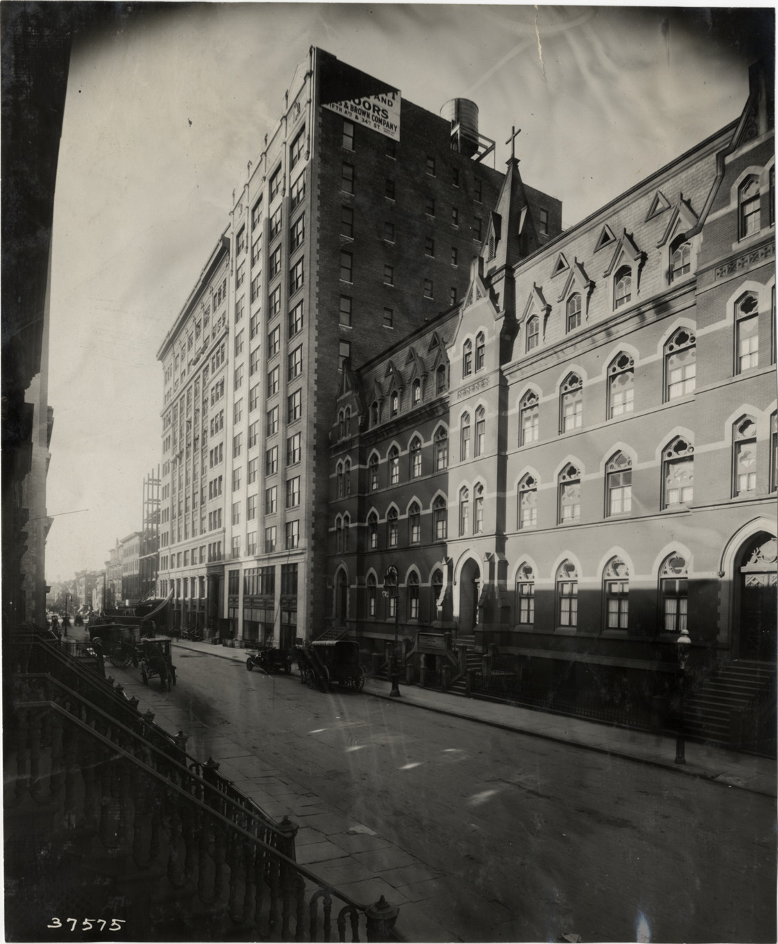 View of multistory religious building with cross on roof; commercial buildings on left. Stamped on back: "Spooner & Wells, Inc., photographers, telephones 3472-3473 Columbus, 1931 Broadway, New York." Handwritten on back: "Architecture--Domestic, 1910."