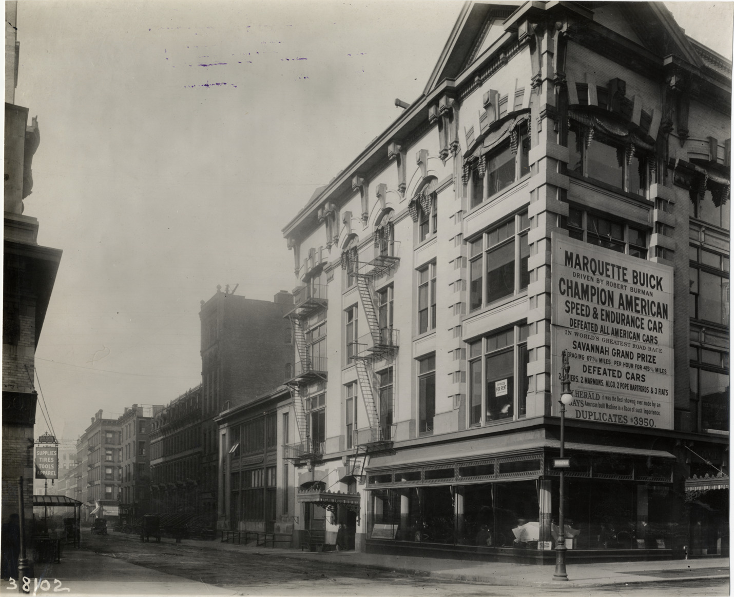 View of four-story Italianate building on corner; sign on building reads: "Marquette Buick driven by Robert Burman. Champion American speed & endurance car defeated all American cars in world's greatest road race. Savannah grand prize averaging 67 7/10 miles per hour for 415 2/10 miles. Defeated cars, 2 Loziers, 2 Marmons, Alco, 2 Pope Hartfords & 3 Fiats. Herald says, it was the best showing ever made by an American built machine in a race of such importance. Duplicates $3950." Stamped on back: "Spooner & Wells, Inc., photographers, telephones 3472-3473 Columbus, 1931 Broadway, New York." Handwritten on back: "Architecture--Domestic, 1910."