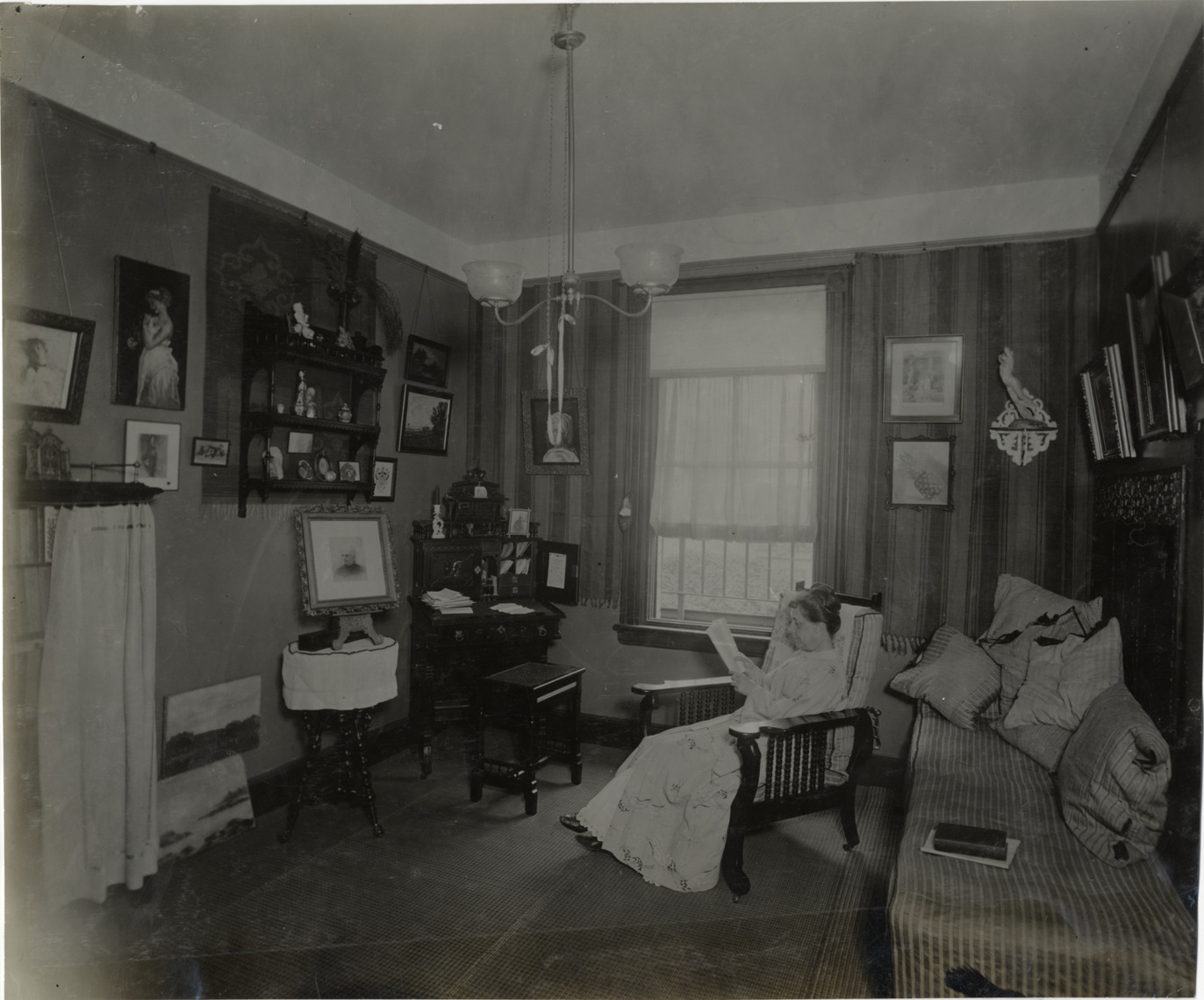 View of woman reading in armchair in living room. Room is furnished with desk, sofa, artwork and shelves. Stamped on back: "Spooner and Wells, 1931 Broadway, New York, duplicates any time, enlargements all sizes, tel. 3472-3473 Col., credit appreciated." Handwritten on back: "Architecture--Domestic, 1906."