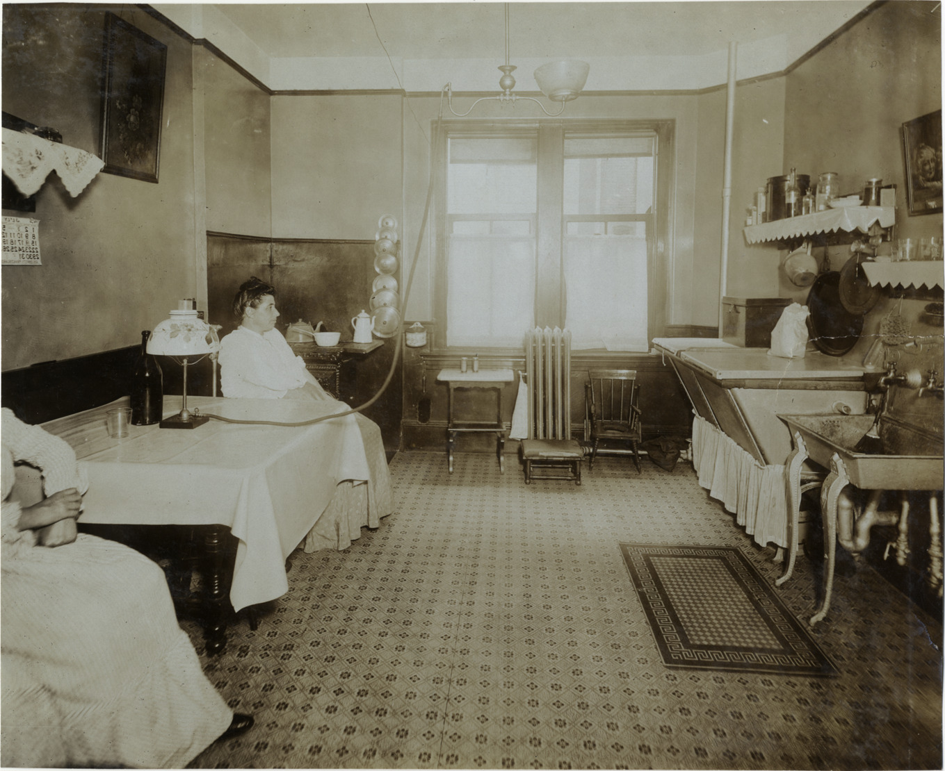 Favorite this☆ Women sitting in kitchen Description: View of two women sitting next to kitchen table. Room is furnished with sink and stove; lamp on table is connected to overhead light fixture suspended from ceiling. Artwork displayed on walls. Handwritten on back: "Architecture--Domestic, 1906." Details Resource ID: na003574 Subject: Kitchens Women Sinks (Plumbing) Photographic prints Date Issued: 1906 Format: 1 photographic print ; 7.5 x 9 in. Member of: National Automotive History Collection Lazarnick Collection Filing Location: Architecture--Domestic #10 Rights: Physical rights are retained by DPL. Copyright is retained in accordance with U.S. copyright laws.