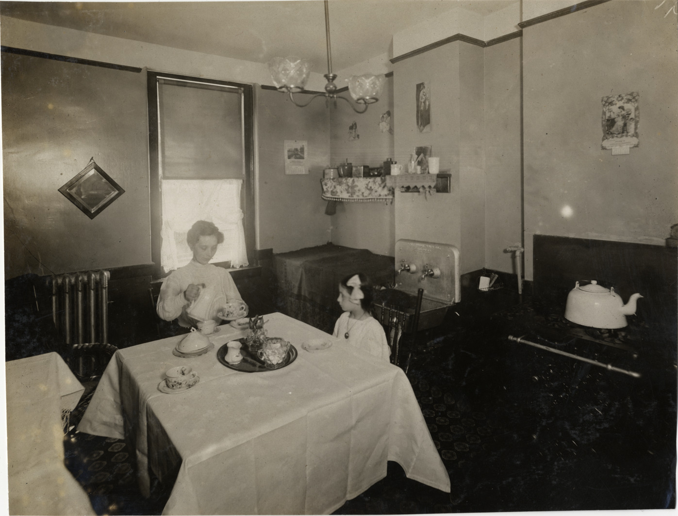 Favorite this☆ Woman and girl sitting at kitchen table Description: View of woman pouring tea for girl at kitchen table. Room is furnished with stove and sink; artwork displayed on walls. Handwritten on back: "Architecture--Domestic, 1906." Details Resource ID: na003587 Subject: Kitchens Tables Women Girls Photographic prints Date Issued: 1906 Format: 1 photographic print ; 7 x 9.5 in. Member of: National Automotive History Collection Lazarnick Collection Filing Location: Architecture--Domestic #10 Rights: Physical rights are retained by DPL. Copyright is retained in accordance with U.S. copyright laws.