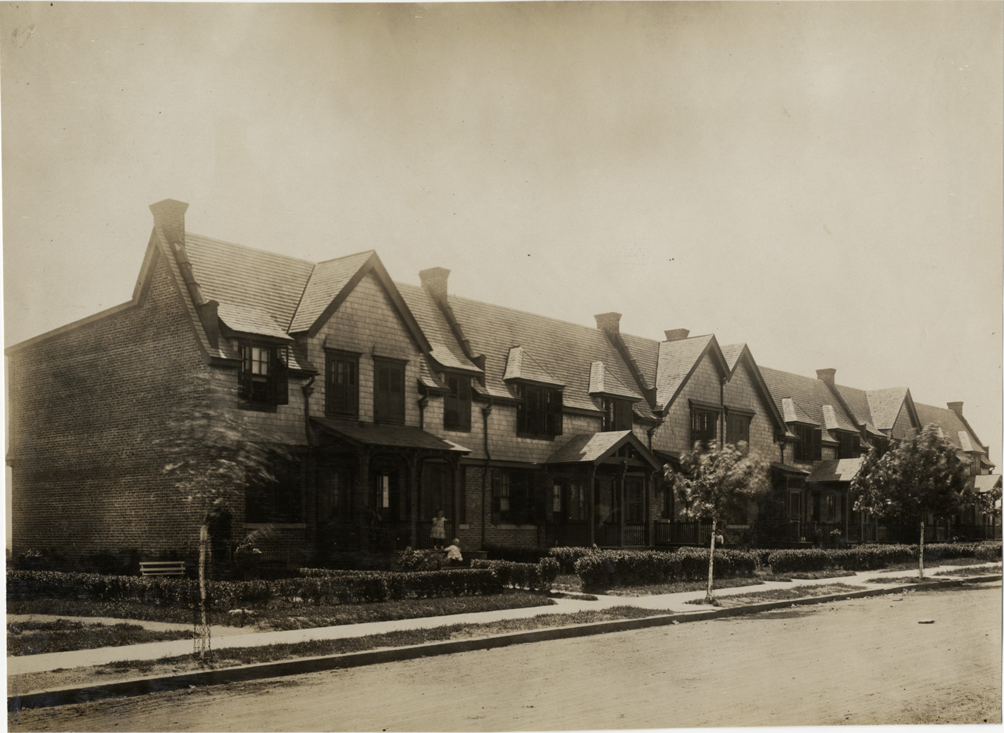 View at an angle of two-story brick row houses with covered entry porches; shingle wall cladding on second story. Children play on porch. Handwritten on back: "Architecture--Domestic, 1906."