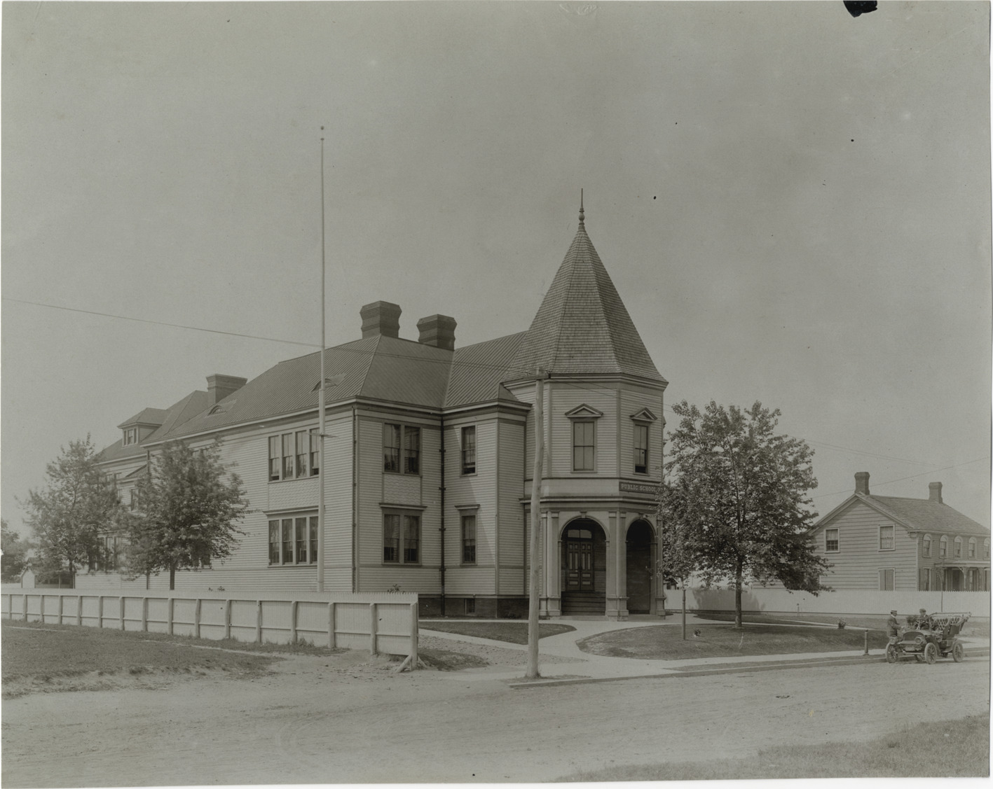 View of two-story wooden-frame school building with turret; sign over entrance: "Public School 27." Two men with car in front of school. Stamped on back: "Photo by F. Ed. Spooner, 1536 B'way, telephone 6536-38th St., New York, N.Y." Handwritten on back: "Architecture--Domestic, 1906."