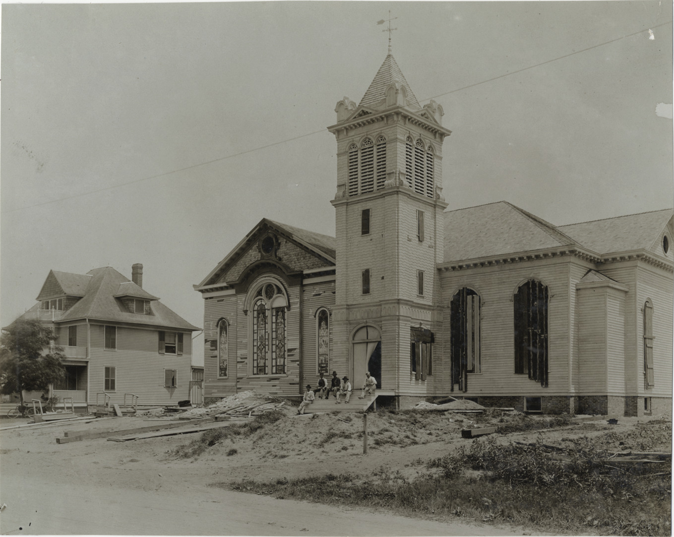View of wooden-frame church building during construction; church has bell tower and stained glass windows. Workmen sit on steps on front of building; wooden-frame house in background. Stamped on back: "Photo by F. Ed. Spooner, 1536 B'way, telephone 6536-38th St., New York, N.Y." Handwritten on back: "Architecture--Domestic, 1906."