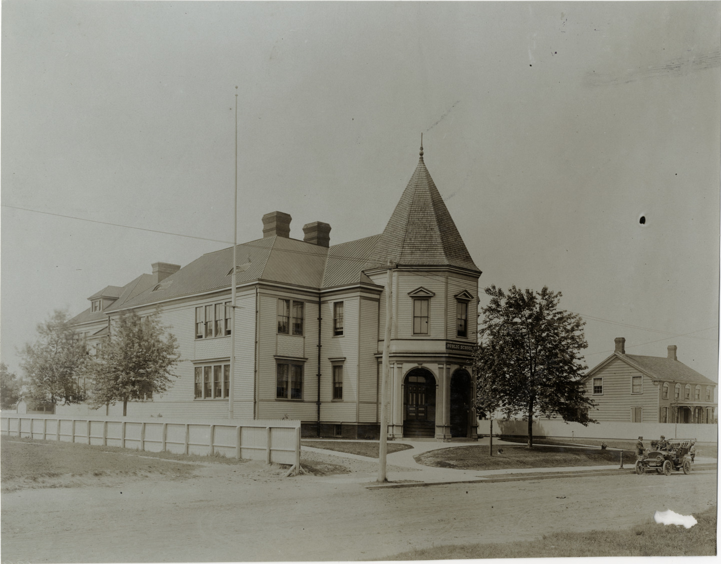 View of two-story wooden-frame school building with turret; sign over entrance: "Public School 27." Two men with car in front of school. Stamped on back: "Photo by F. Ed. Spooner, 1536 B'way, telephone 6536-38th St., New York, N.Y." Handwritten on back: "Architecture--Domestic, 1906."