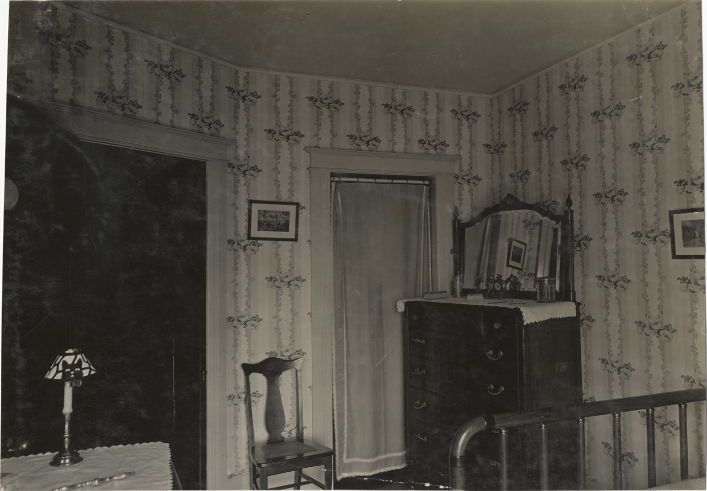 View of bedroom in Robinson residence. Room is furnished with chest of drawers with mirror, lamp, bed and chair. Handwritten on back: "Architecture--Domestic, 1910. Robinson's home, 3000 N. Grand Blvd."