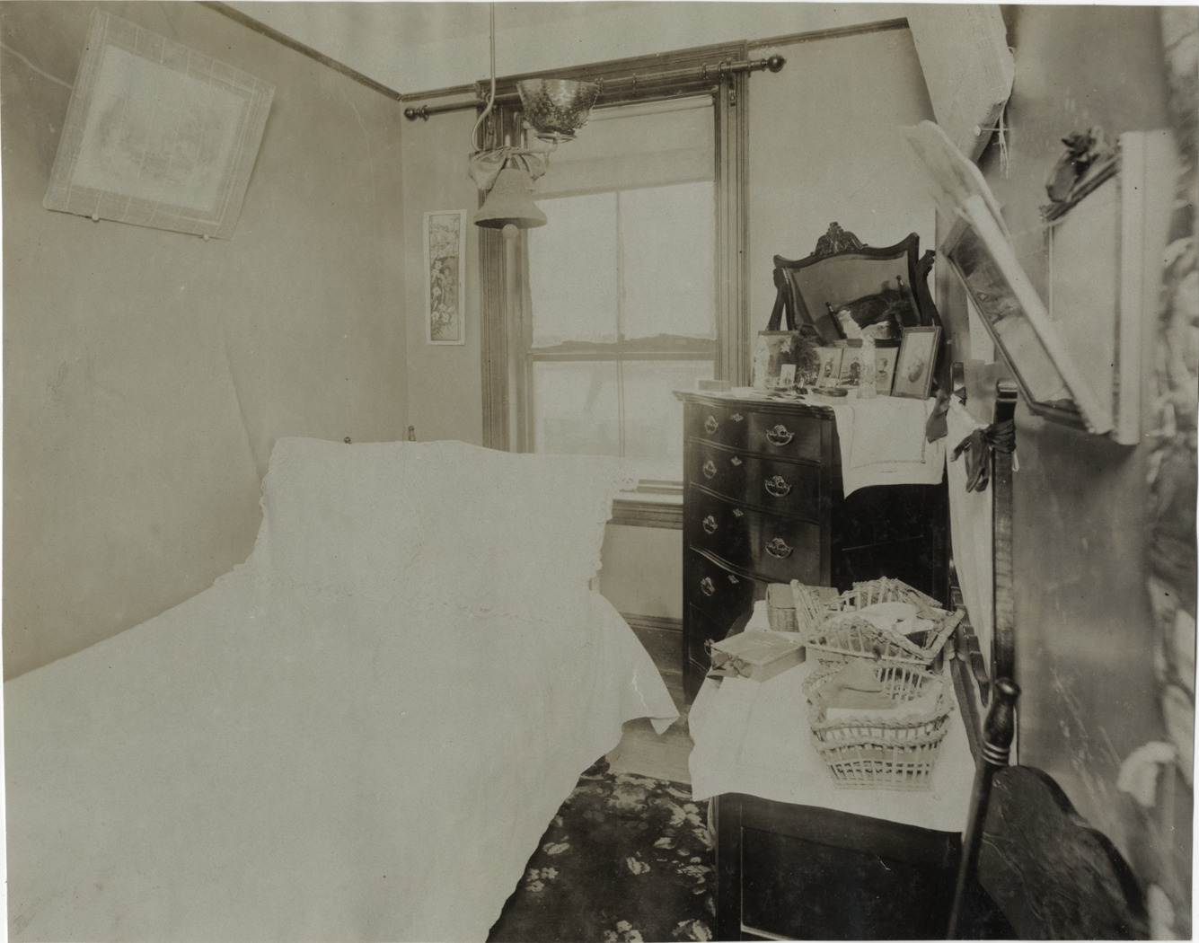 View of bedroom furnished with bed and chest of drawers with mirror. Small baskets on top of side table. Stamped on back: "F. Ed. Spooner, and Chas. S. Wells. Motor News, Motor Photos, Motor Adv, 1536 B'way, New York. Tel 6536-38th St." Handwritten on back: "Architecture--Domestic, 1907."