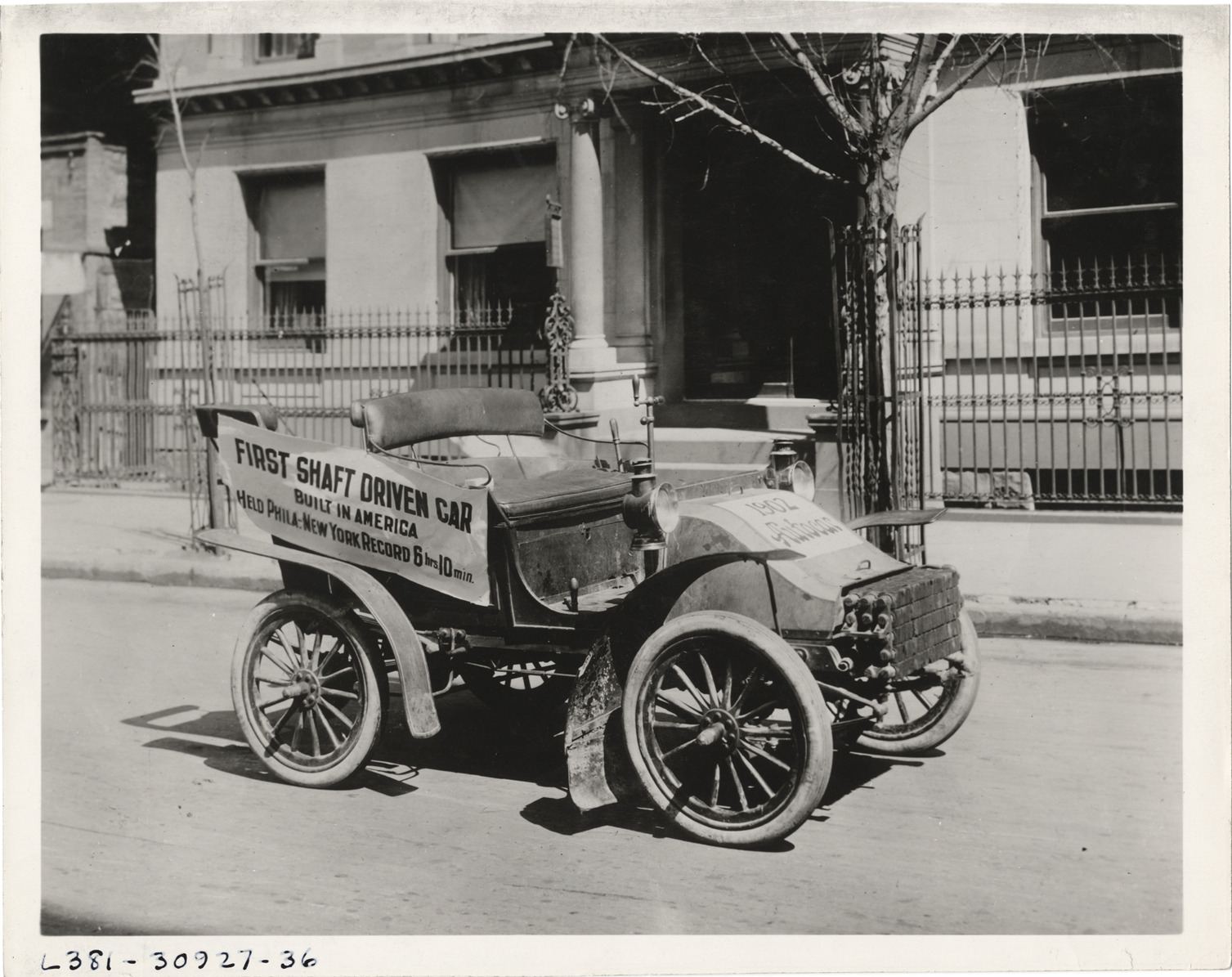 Favorite this☆ 1902 Autocar automobile Description: View of 1902 Autocar automobile parked in front of building. Banner on car: "First shaft driven car built in America, held Phila-New York record, 6 hrs. 10 min." Sign on hood: "Autocar, 1902." Handwritten on back: "Autocar, 1902." Details Resource ID: na003700 Subject: Autocar Company Automobiles Photographic prints Date Issued: 1902 Format: 1 photographic print ; 8 x 10 in. Member of: National Automotive History Collection Lazarnick Collection Filing Location: Autocar Rights: Physical rights are retained by DPL. Copyright is retained in accordance with U.S. copyright laws.