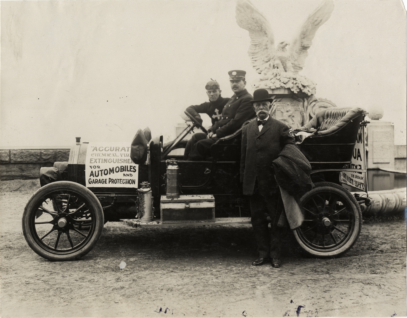 View of three men with unidentified car; sign on hood: "Accurate chemical fire extinguishers for automobiles and garage protection." Fire extinguisher canisters on running board; sculpture of eagle in background. Handwritten on back: "Automobiles--Unidentified, 1908."