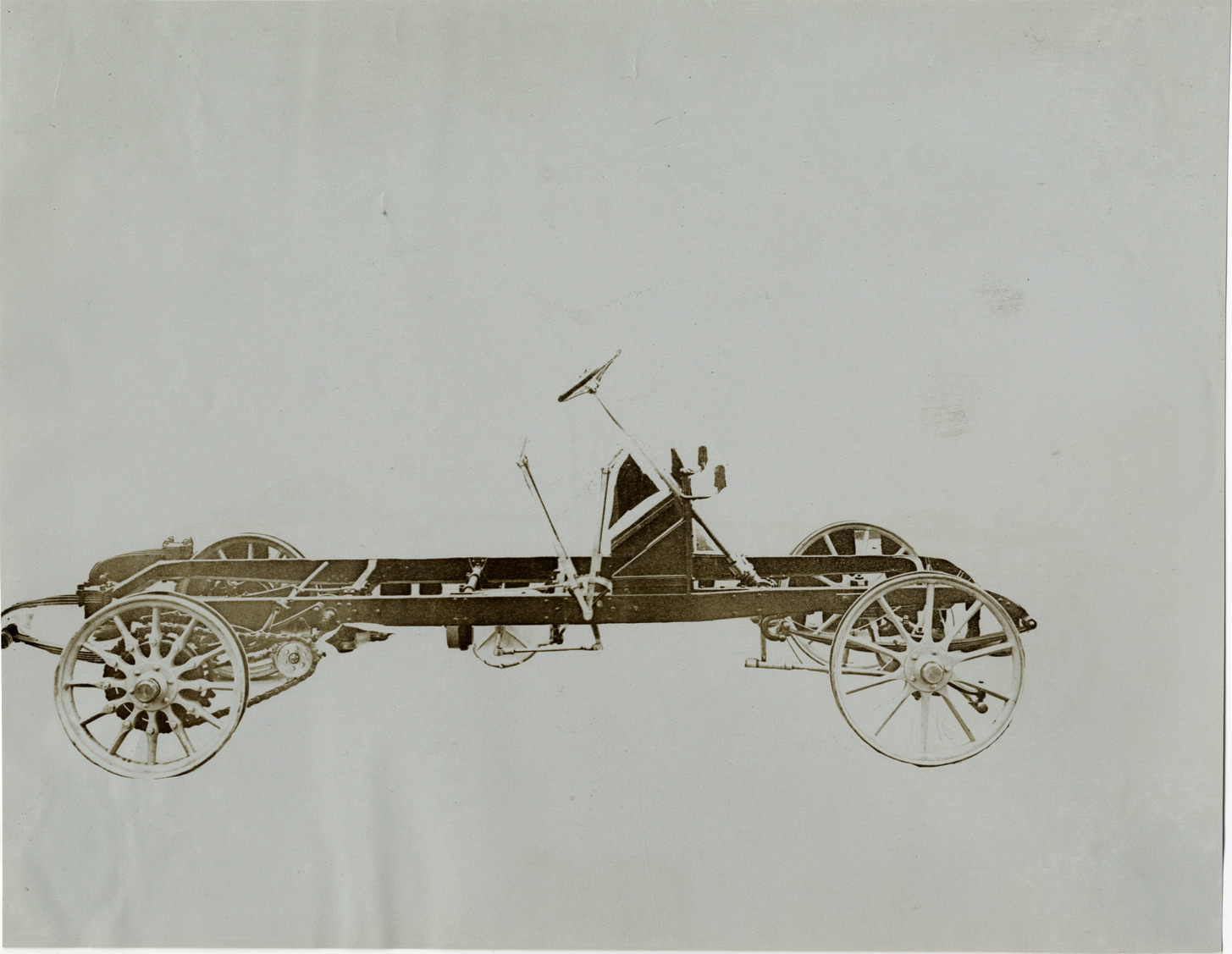 View of unidentified car chassis. Stamped on back: "Photo by F. Ed. Spooner, 1536 B'way, telephone 6536-38th St., New York, N.Y." Handwritten on back: "Automobiles--Unidentified, 1906."