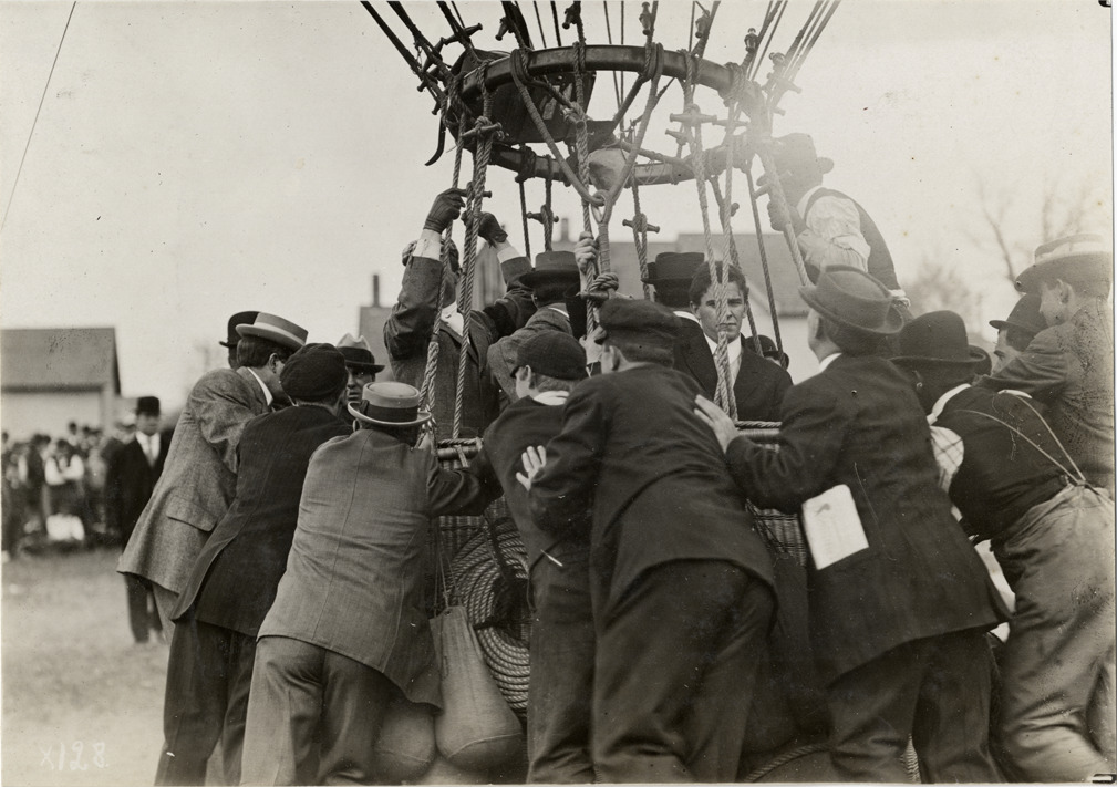View of men surrounding basket of hot air balloon at Jackson, Michigan. Stamped on back: "Spooner & Wells, Inc., photographers, telephone North 1745. 1231 Woodward Ave., Detroit, Mich. Detroit, 1231 Woodward, New York, 1931 Broadway." Handwritten on back: "Balloons--Jackson, Mich., balloon flight, 1910. April, 1910."