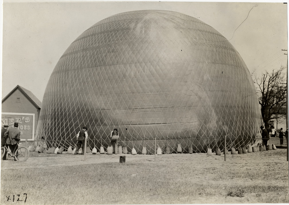 View of hot air balloon weighted to ground by sandbags at Jackson, Michigan. Several men stand around edge of balloon. Stamped on back: "Spooner & Wells, Inc., photographers, telephone North 1745. 1231 Woodward Ave., Detroit, Mich. Detroit, 1231 Woodward, New York, 1931 Broadway." Handwritten on back: "Balloons--Jackson, Mich., balloon flight, 1910. April, 1910."