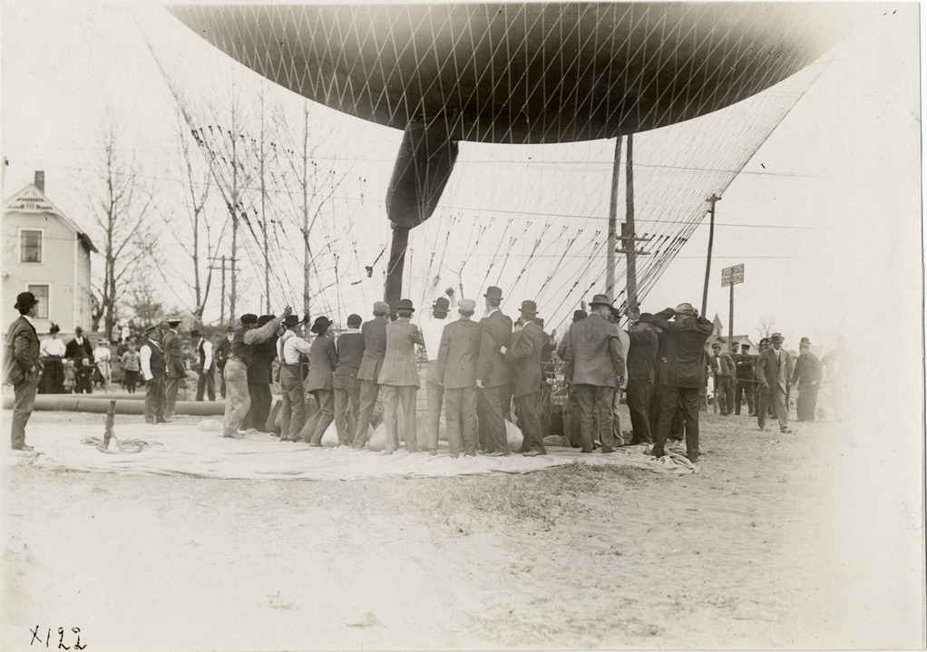 View of men surrounding hot air balloon tethered to ground at Jackson, Michigan; balloon is weighted to ground by sandbags. Railroad crossing sign in background. Stamped on back: "Spooner & Wells, Inc., photographers, telephone North 1745. 1231 Woodward Ave., Detroit, Mich. Detroit, 1231 Woodward, New York, 1931 Broadway." Handwritten on back: "Balloons--Jackson, Mich., balloon flight, 1910. April, 1910."