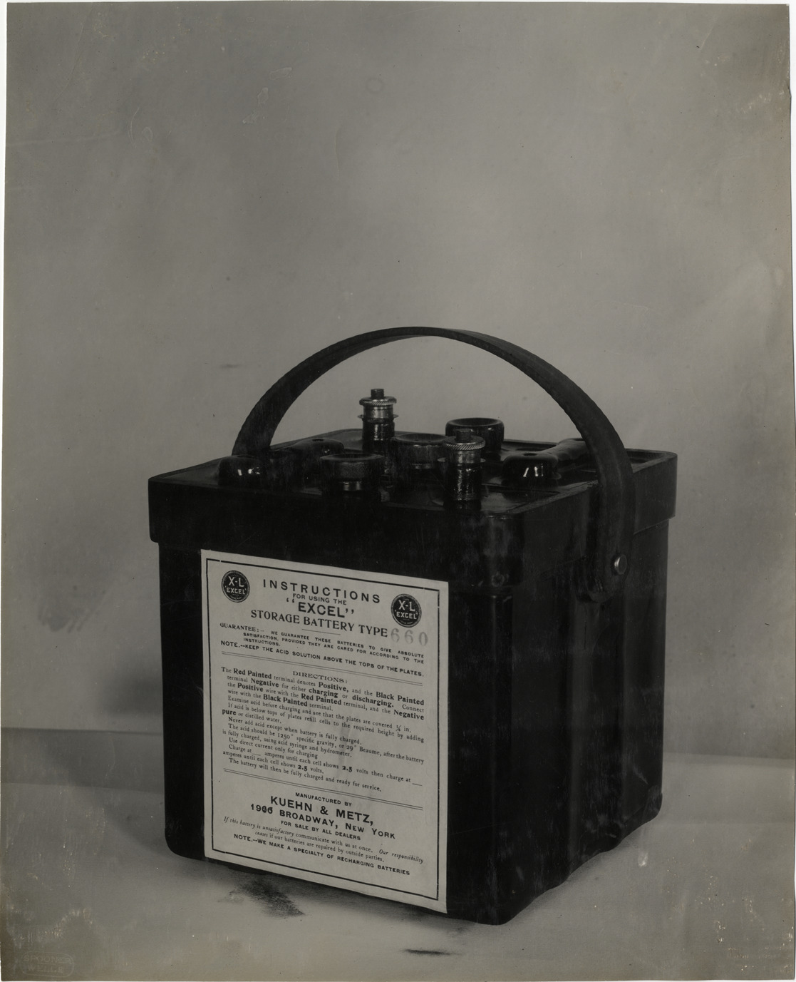 View of Excel storage battery for car. Label on battery: "Instructions for using the 'Excel' storage battery type. Manufactured by Kuehn & Metz, 1966 Broadway, New York, for sale by all dealers." Stamped on back: "Spooner & Wells, Inc., photographers, telephones 3472-3473 Columbus, 1931 Broadway, New York." Handwritten on back: "Batteries--Excel, 1910."
