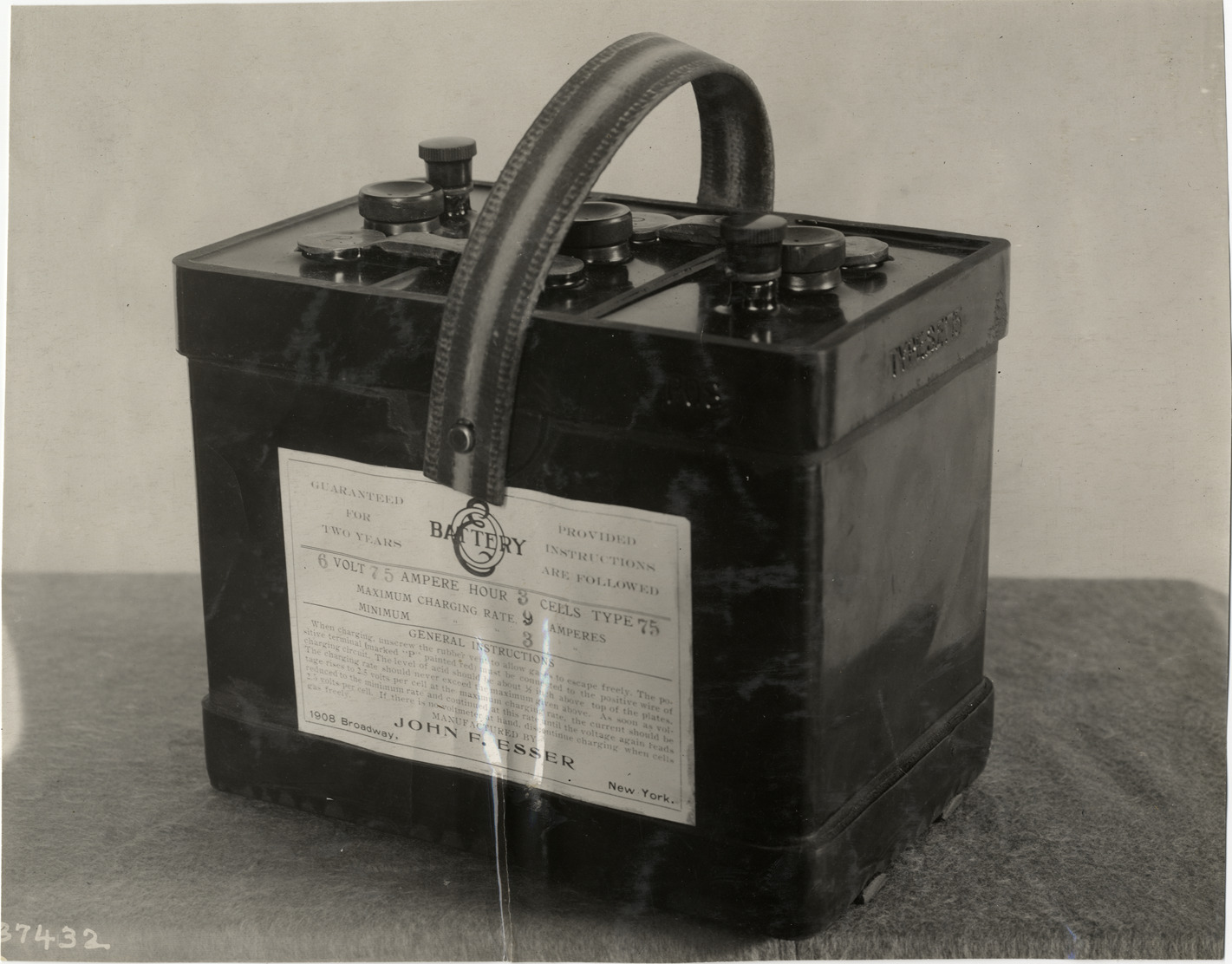 View of Esser battery for car. Label on battery: "Guaranteed for two years. Manufactured by John F. Esser, 1908 Broadway, New York." Stamped on back: "Spooner & Wells, Inc., photographers, telephones 3472-3473 Columbus, 1931 Broadway, New York." Handwritten on back: "Batteries--Esser, 1910."