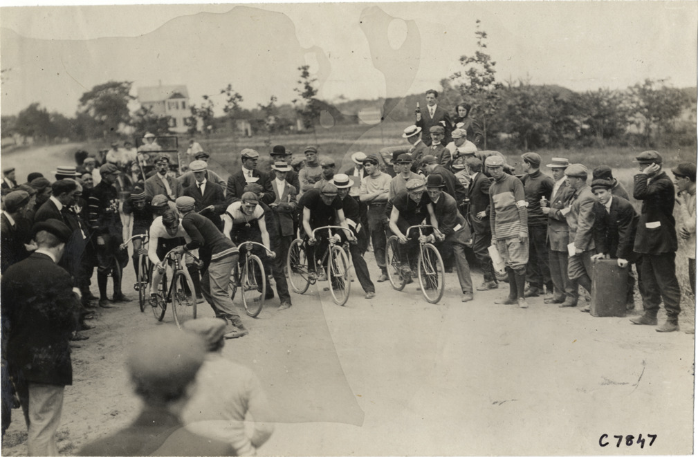 View of bicyclists at start of Valley Stream Wheelmen Marathon bicycle race. Onlookers stand on sidelines. Stamped on back: "Spooner & Wells, Inc., photographers, telephones 3472-3473 Columbus, 1931 Broadway, New York." Handwritten on back: "Bicycle races--Valley Stream Wheelmen Marathon, 1909."