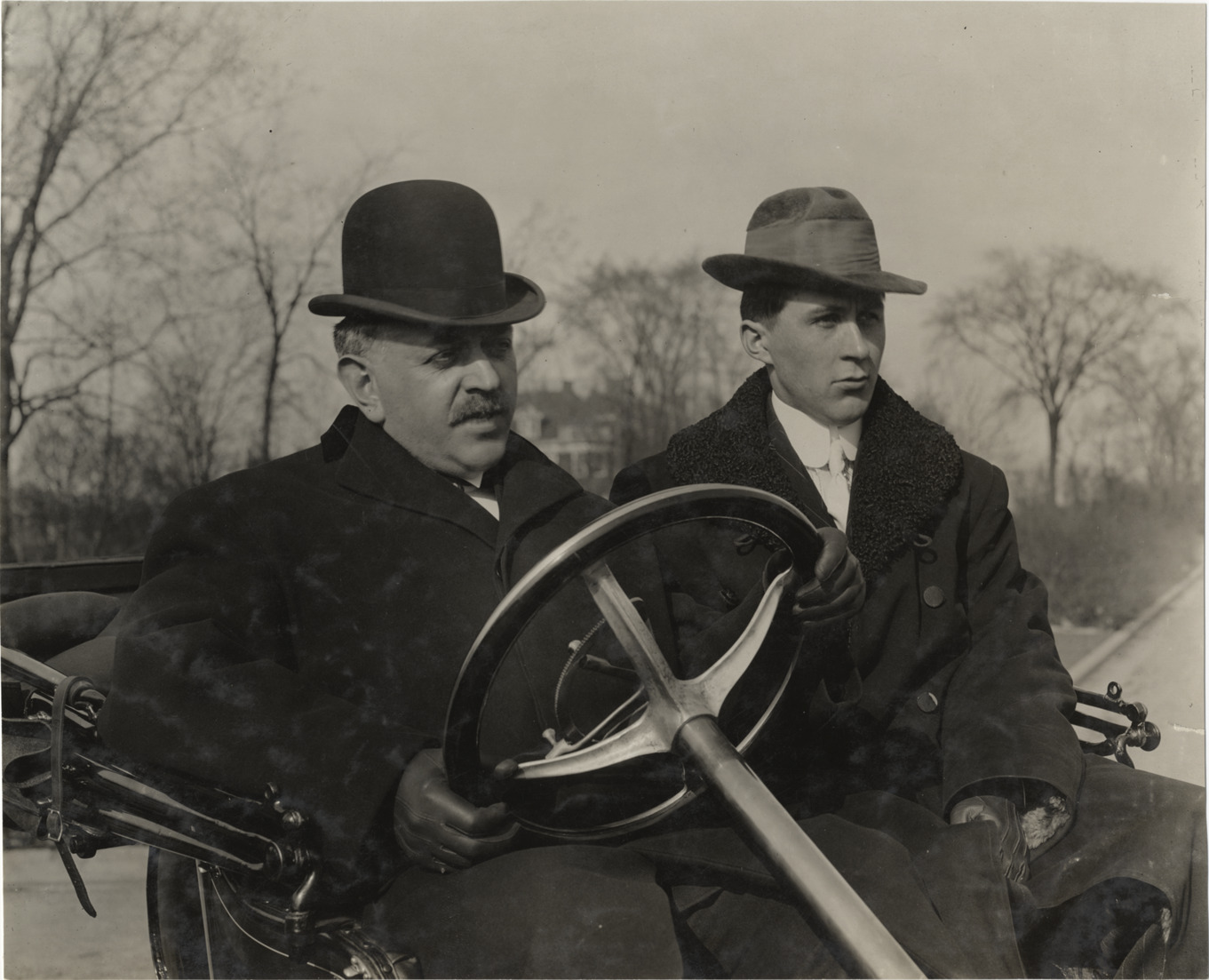 View of Detroit mayor Philip Breitmeyer and Michigan State Senator John N. Anhut posing in Anhut car. Stamped on back: "Spooner & Wells, Inc., photographers, telephone North 1745. 1231 Woodward Ave., Detroit, Mich. Detroit, 1231 Woodward, New York, 1931 Broadway." Handwritten on back: "Biography--Breitmeyer, mayor of Detroit, 1910, Senator Anhut."