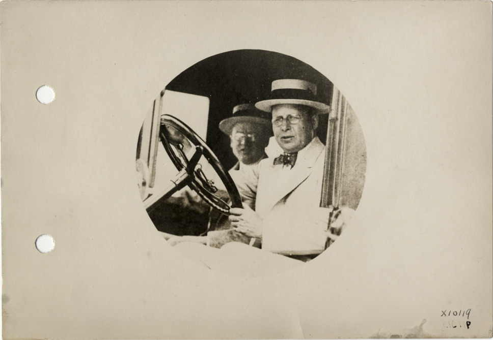 Favorite this☆ Hugh Chalmers in automobile Description: View of Hugh Chalmers, president of the Chalmers Motor Car Co., and unidentified man, sitting in car. Handwritten on back: "Biography--Chalmers, Hugh. Copy photo Hugh Chalmers, for Chalmers Motor Co." Details Resource ID: na003844 Subject: Automobile industry executives Automobile drivers Automobile occupants Photographic prints Date Issued: Unknown year Format: 1 photographic print ; 4.5 x 6.5 in. Member of: National Automotive History Collection Lazarnick Collection Filing Location: Biography--Chalmers, Hugh Rights: Physical rights are retained by DPL. Copyright is retained in accordance with U.S. copyright laws.