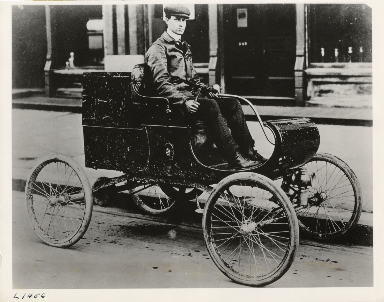 View of Roy D. Chapin, president of the Hudson Motor Car Company, driving an Oldsmobile car. Handwritten on back: "Biography--Chapin, Roy." Typed on back: "Many of America's leading motor car manufacturers began their careers as mechanics and test-drivers. An exception was the late Roy D. Chapin, who got his start with Oldsmobile at the turn of the century as a photographer. Ind addition, he spent from eight to ten hours a day filing castings by hand. He loved the work, and because of his diligence and enthusiasm, attracted the attention of R.E. Olds, founder and president of the comapny. When asked by the latter if he would like to drive from Detroit to New York, young Chapin leaped at the chance. He is shown here with the 1902 Oldsmobile car in which he made the trip, the first of its king up to that time. It was extremely arduous and required nine days to complete. On his way down Fifth Avenue the Runabout skidded into the curb, damaging one of the wire wheels, in spite of which he made his haven at the hotel where Mr. Olds was anxiously waiting. The doorman would not admit the young man in greasy garments, and Chapin had to find his way around the building and sneak in unobserved through the servants' entrance to find his employer. How times change! This same hotel now caters whole-heartedly to personnel of this vast automobile industry. In his later years Chapin became of America's most prominent business figures. He organized the Hudson Motor Car Company and was Secretary of Commerce in the Hoover cabinet."