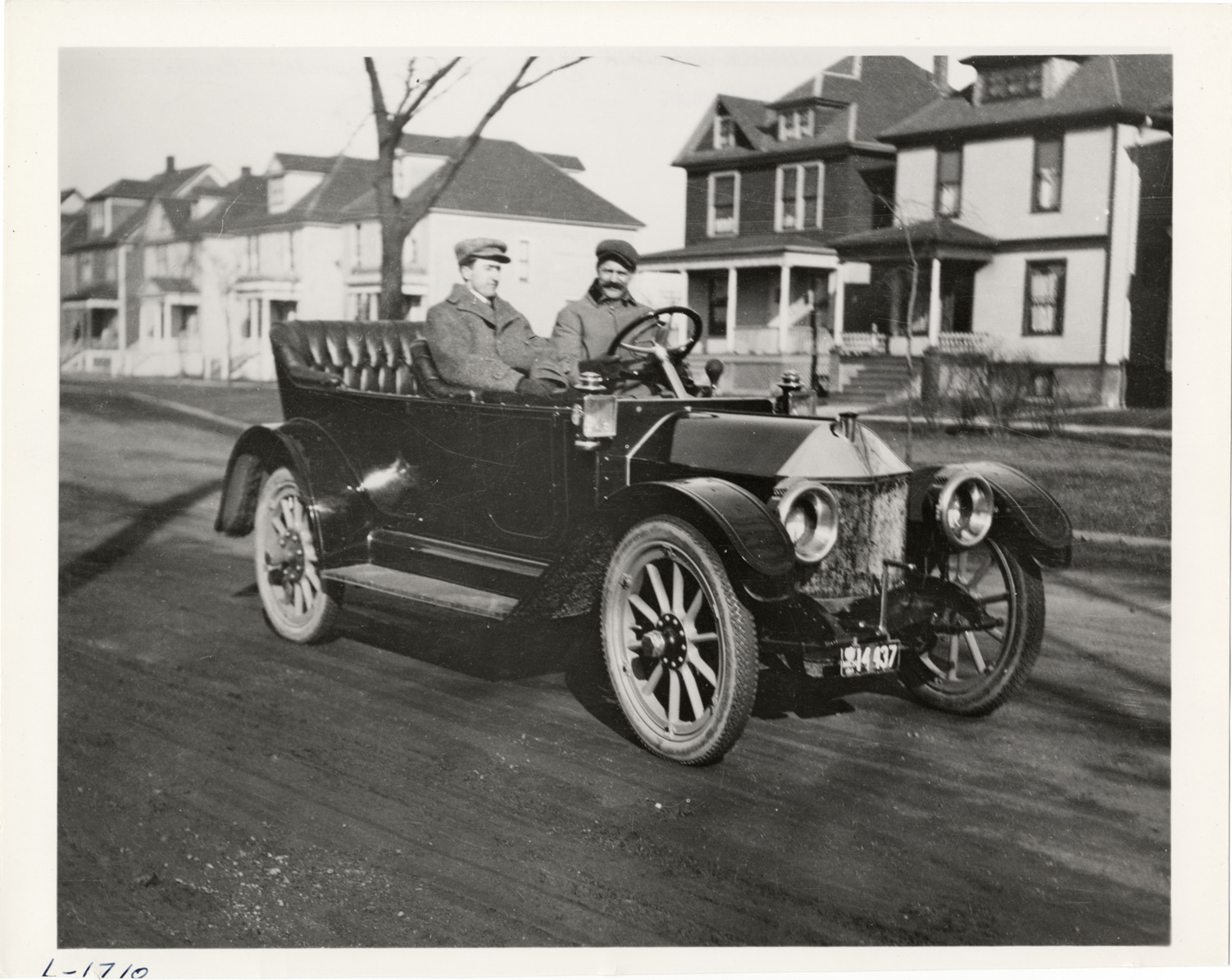 View of Louis Chevrolet and Mr. Murphy, secretary to W.C. Durant, in Chevrolet car. Handwritten on back: "Biography--Chevrolet Brothers." Typed on back: "The first completed Chevrolet was driven on Detroit's West Grand Blvd., near Buchanan by Louis Chevrolet (at the wheel) and Mr. Murphy who was secretary to W.C. Durant. The photograph was taken in the latter part of 1911 by H.R. Winterhoff."