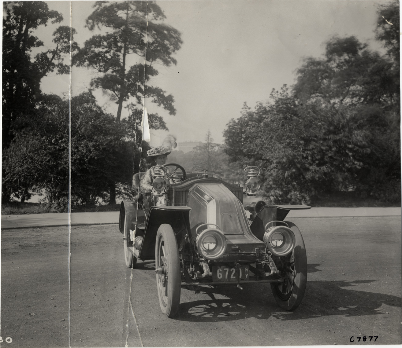 View of Joan Cuneo driving a car. Stamped on back: "Spooner & Wells, Inc., photographers, telephones 3472-3473 Columbus, 1931 Broadway, New York." Handwritten on back: "Biography--Joan Cuneo, taken in 1910."