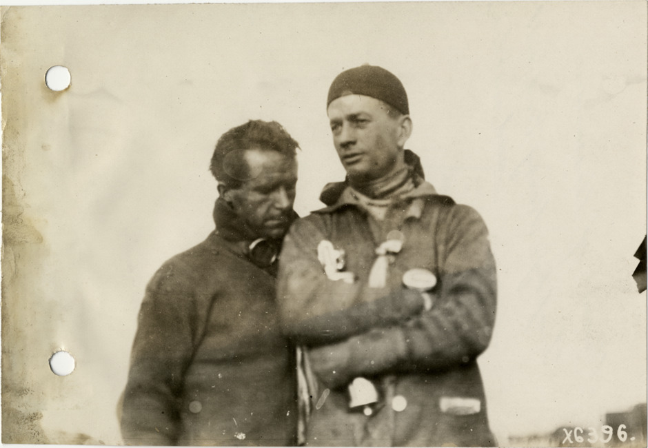 View of driver Harry Endicott and mechanic. Stamped on back: "Spooner & Wells, Inc., photographers, 1231 Woodward Ave., Detroit, Mich., telephone North 1745." Handwritten on back: "Biography--Endicott, Harry. Winner of Wisconsin Trophy, Harry Endicott and mechanic, October 1912."