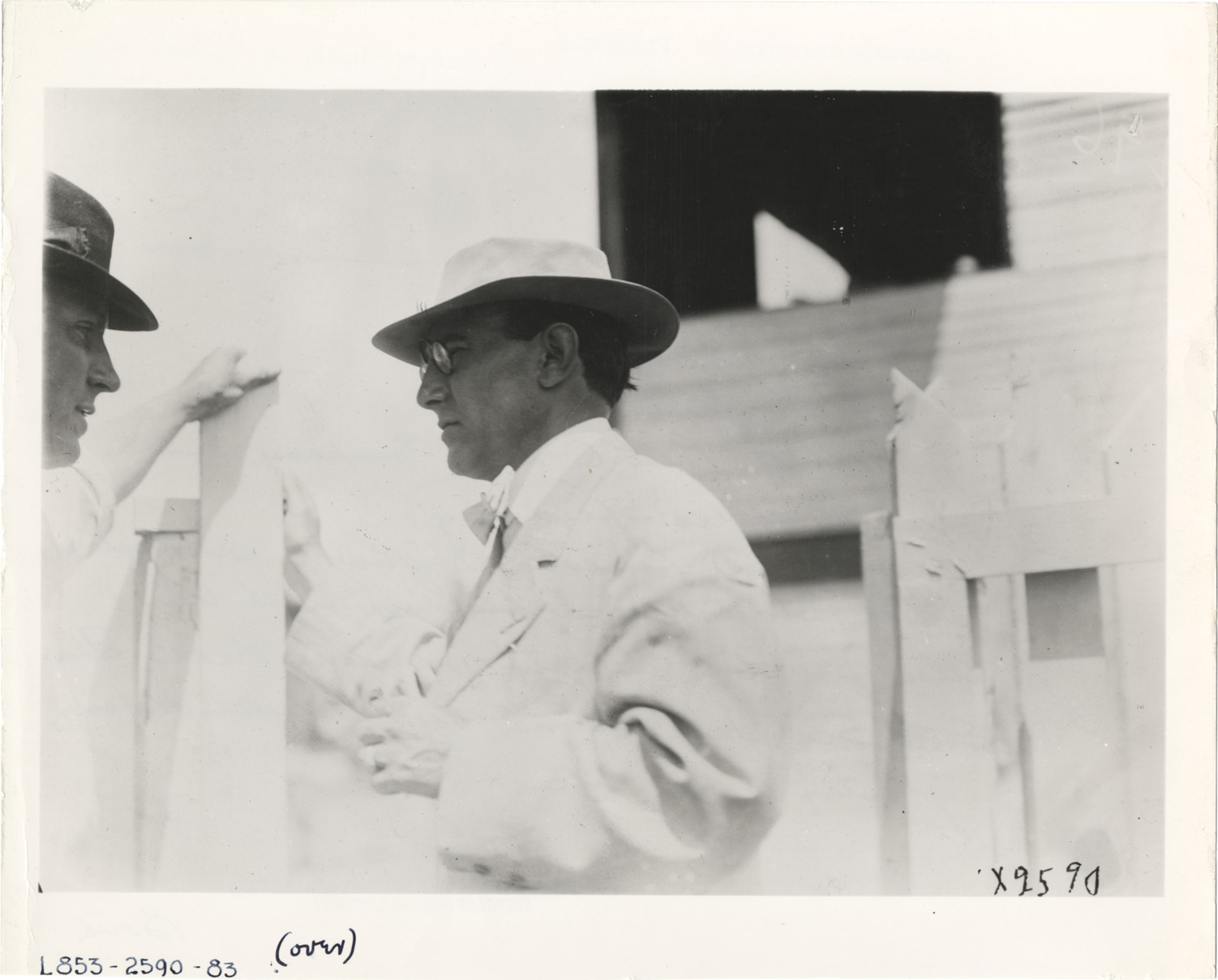 View of Carl Graham Fisher conversing with unidentified man. Handwritten on back: "Biography--Fisher, Carl Graham. Carl Graham Fisher, founder of Prest-O-Lite Company and Indianapolis Speedway, originator of Lincoln Highway Association. which started road building in the U.S. Also founded the city of Miami Beach, Fla. See Jane Fisher's book, Fabulous Hoosier, for story of his life."