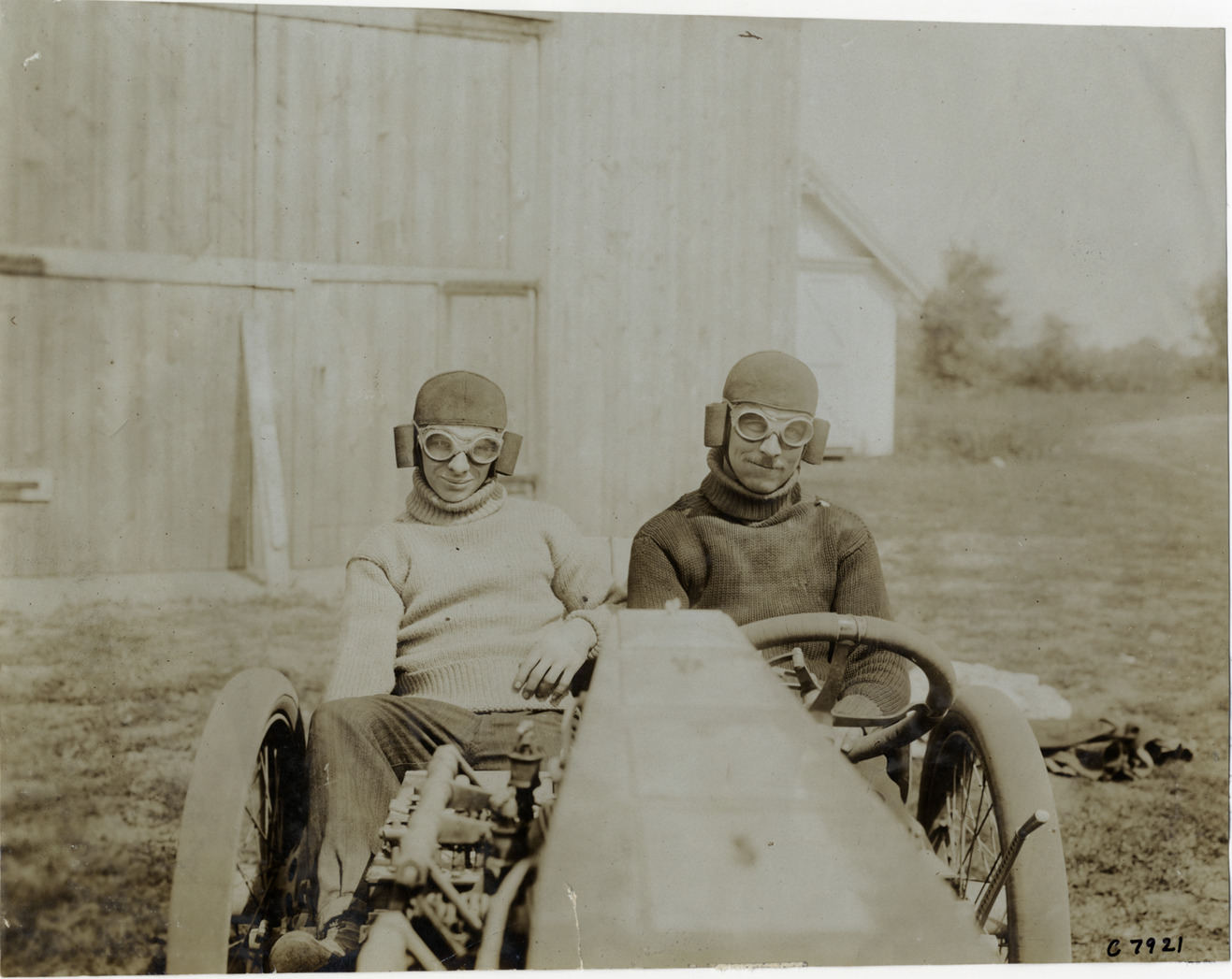 View of driver Lee Frayer and passenger in racecar. Stamped on back: "Photo by Spooner and Wells, 1536 Broadway, New York. Duplicates any time, any quantities, enlargements any size this plate." Handwritten on back: "Biography--Lee Frayer. 1906 Vanderbilt Cup driver. Frayer Miller, Lee Frayer."