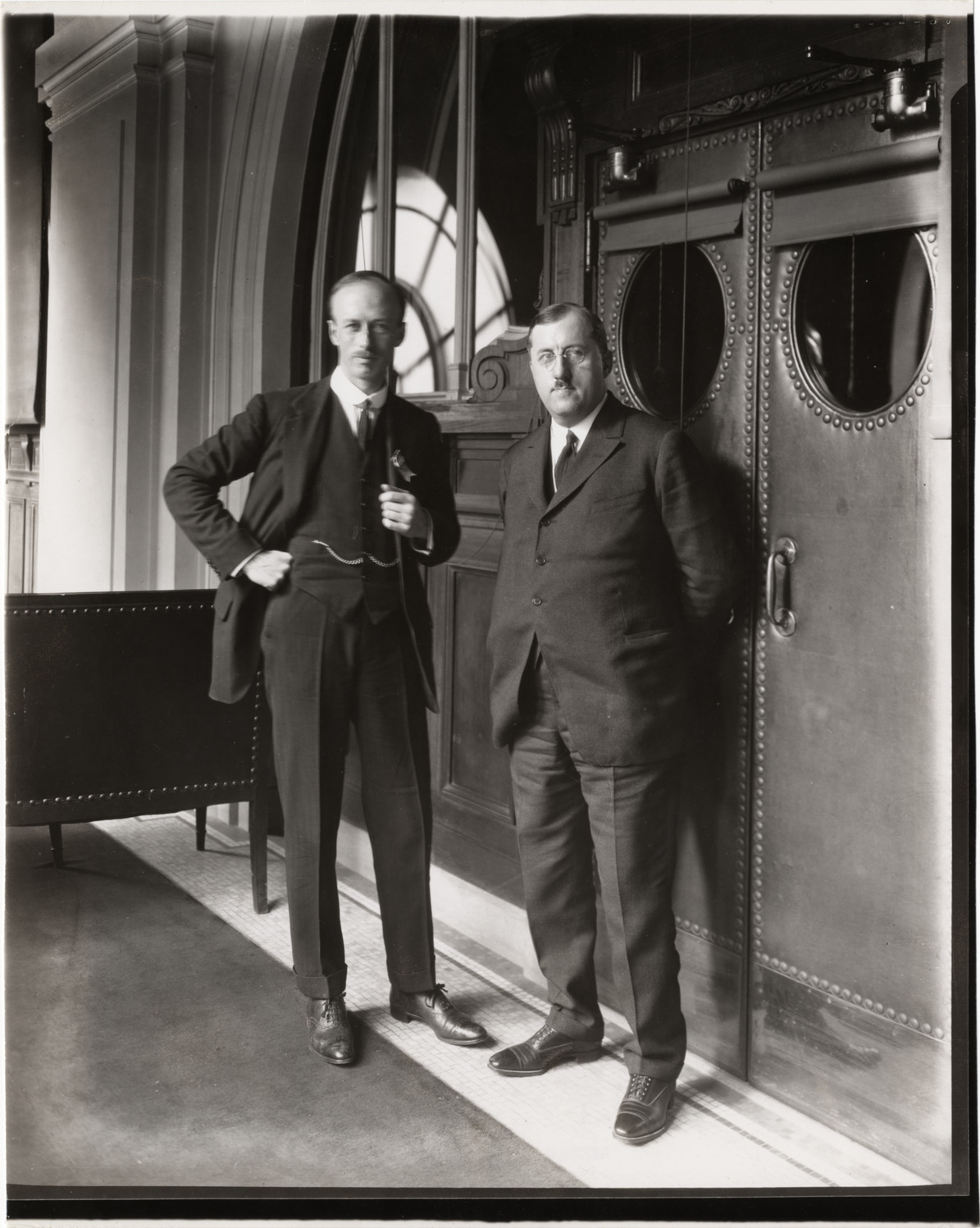 Portrait of Harry L. Horning and unidentified man, standing in front of doorway. Stamped on back: "Photographic illustration by Nick Lazarnick, 230 Park Ave., N.Y." Handwritten on back: "Biography--Horning, Harry L. At right, Harry L. Horning @ Waukesha Motors."