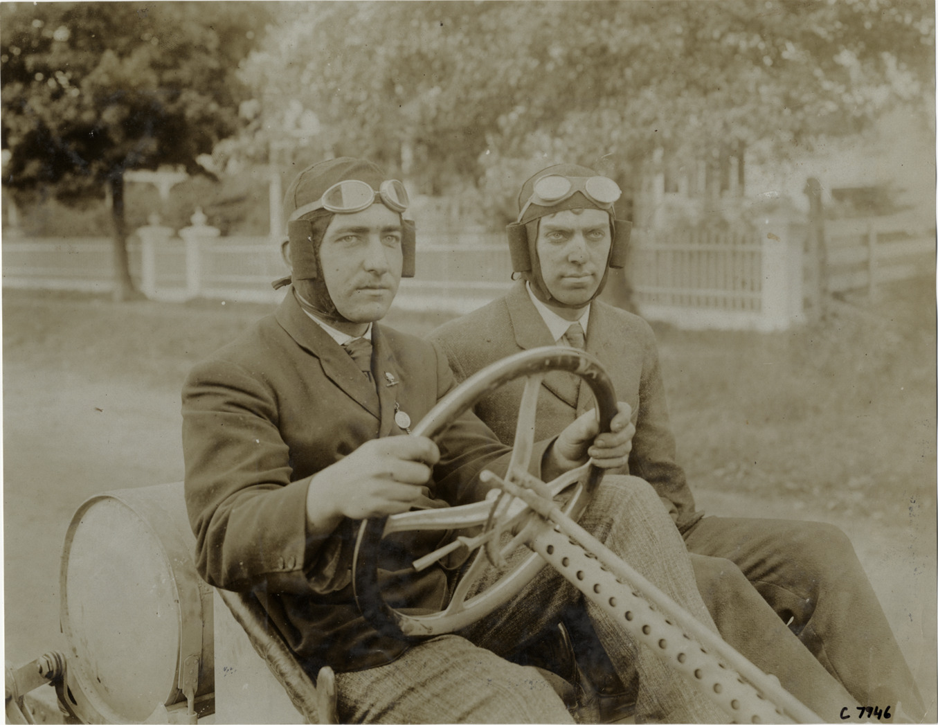 View of driver Ernest Keeler and passenger in racecar. Handwritten on back: "Biography--Ernest Keeler. 1906 Vanderbilt Cup driver."