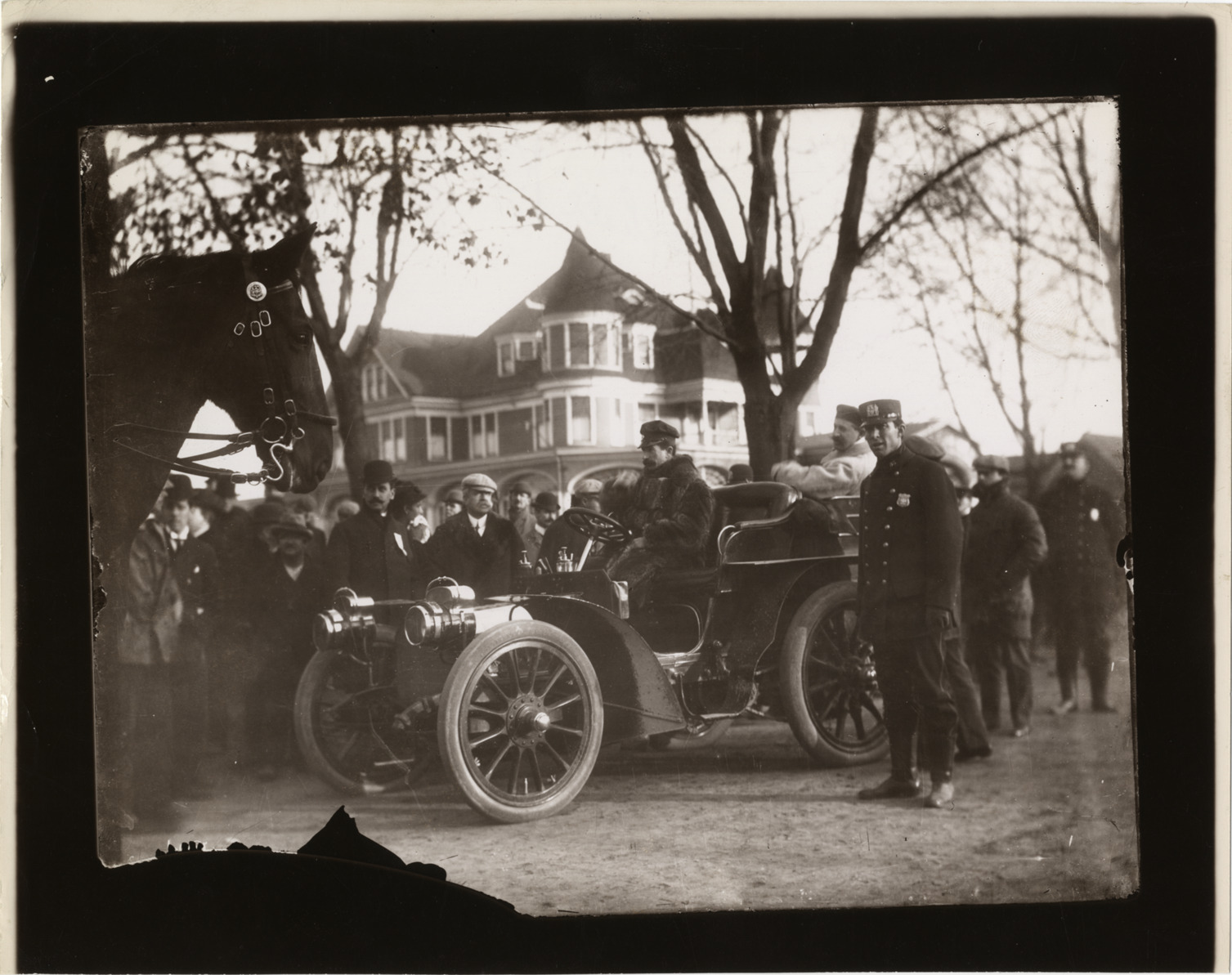 View of driver Foxhall Keene in car; police officers and crowd stand nearby. Horse's head in foreground; house in background. Stamped on back: "Photographic illustration by Nick Lazarnick, 230 Park Ave., N.Y." Handwritten on back: "Biography--Keene, Foxhall."