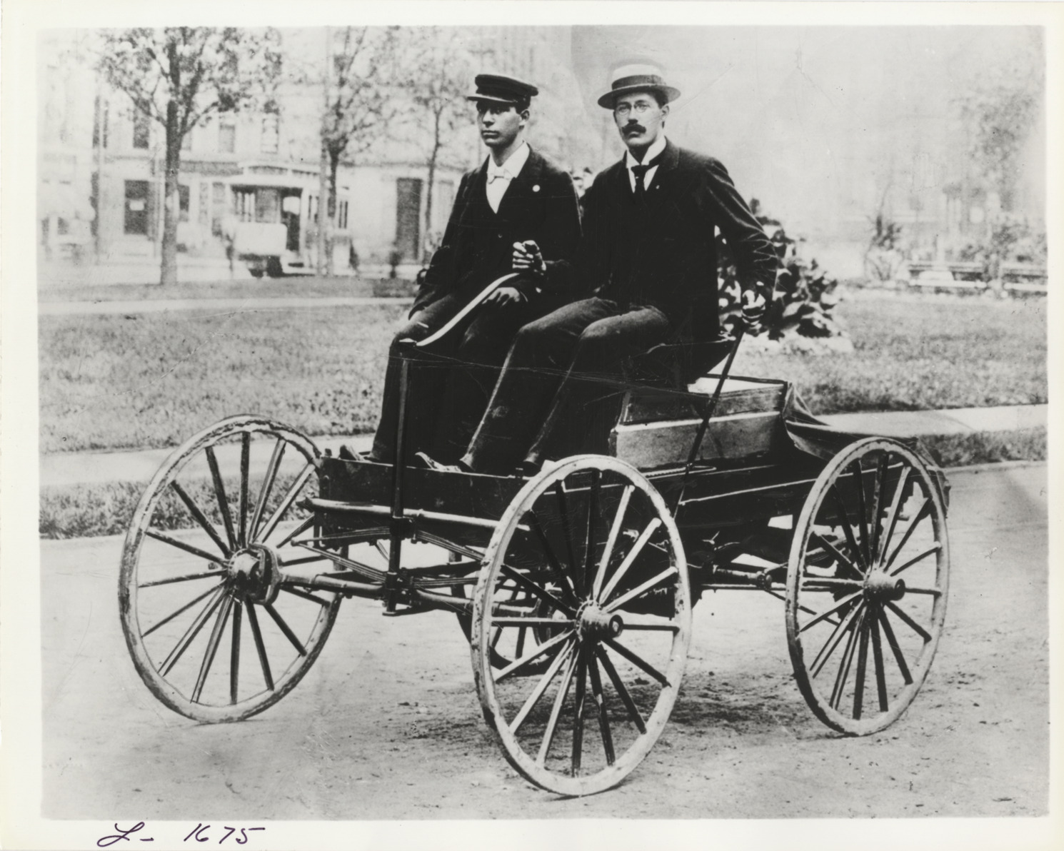 View of Charles Brady King and Oliver E. Barthel in car. Typed on back: "Charles Brady King at the tiller of his first automobile in the summer of 1896. Beside Mr. King is Oliver E. Barthel, who was later associated with Henry Ford as an engineer in the development of the Ford Model T." Handwritten on back: "Biography--King, Charles Brady."