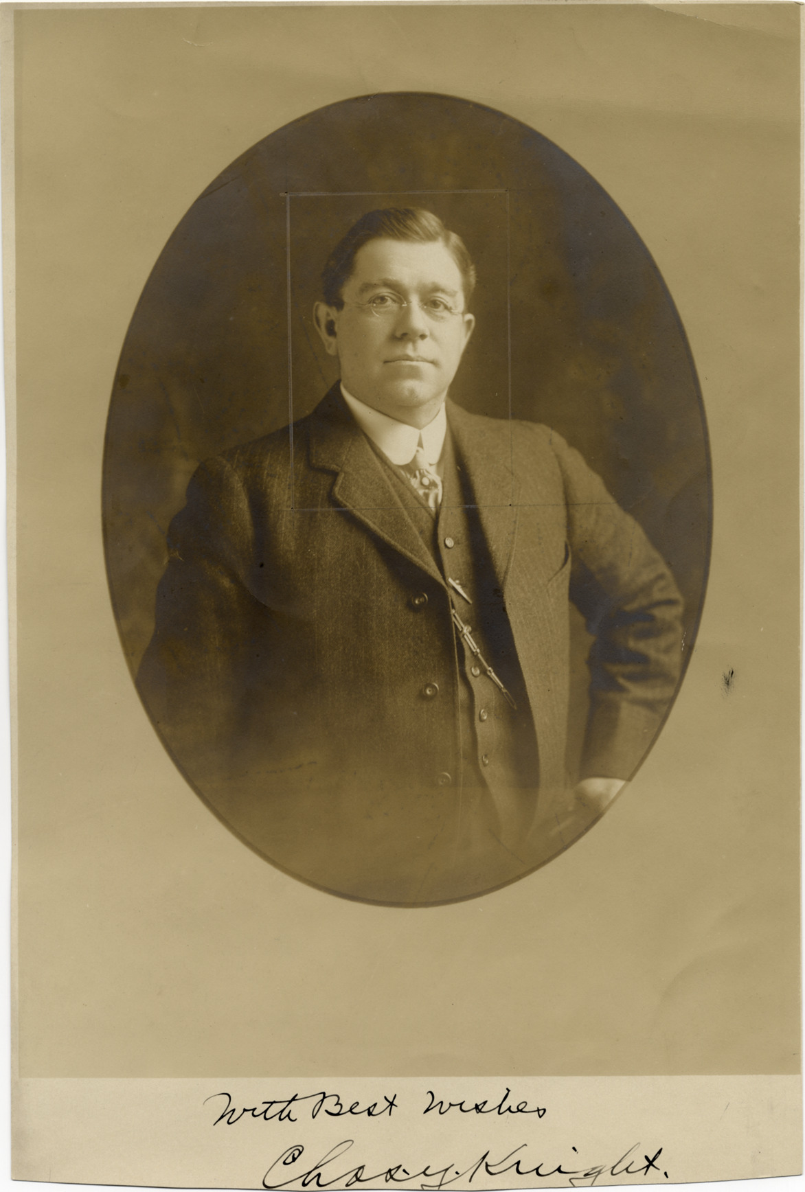 Portrait of Charles J. Knight; autographed on front: "With best wishes, Chas. J. Knight." Handwritten on back: "Biography--Knight, Charles J."