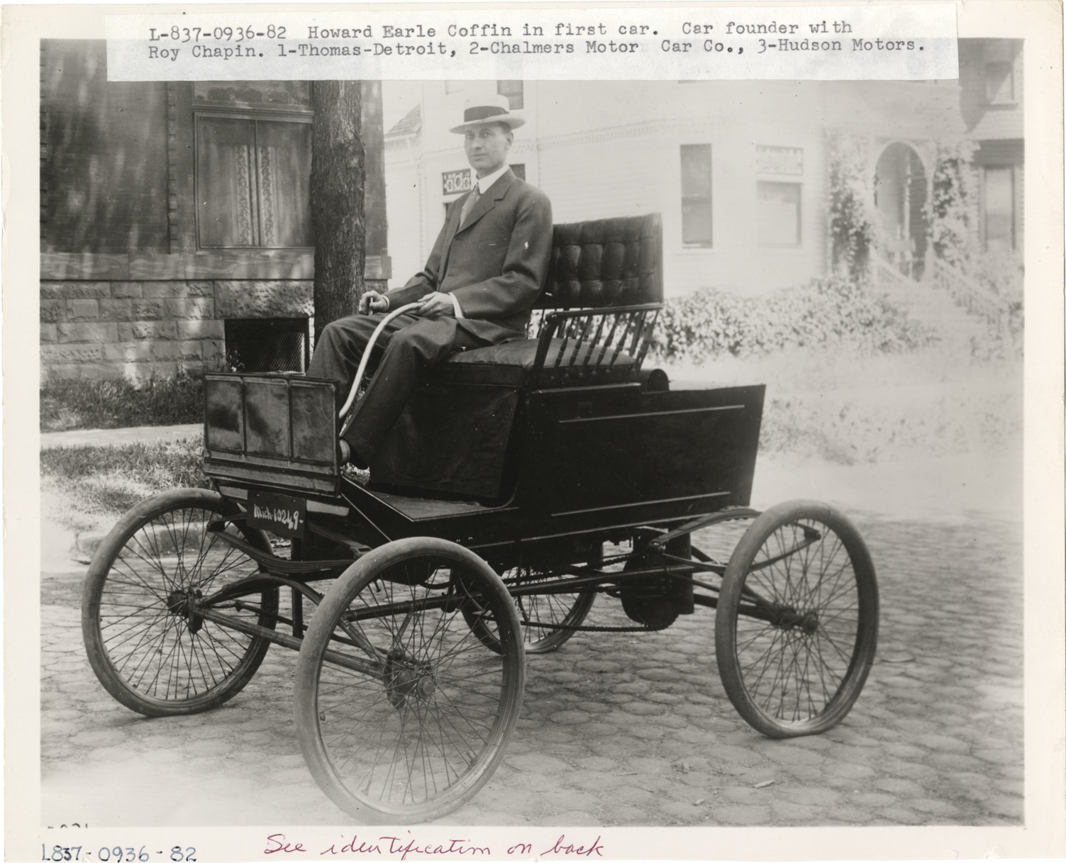 View of Howard Earle Coffin driving 1901 Coffin steamer. Typed on front: "Howard Earle Coffin in first car. Car founder with Roy Chapin. 1-Thomas-Detroit, 2-Chalmers Motor Car Co., 3-Hudson Motors." Handwritten on back: "Biography--Coffin, Howard Earle. Howard Earle Coffin, co-founder (with Roy Chapin) of (1) Thomas-Detroit, (2) Chalmers Motor Car Co., (3) Hudson Motor Car Co."