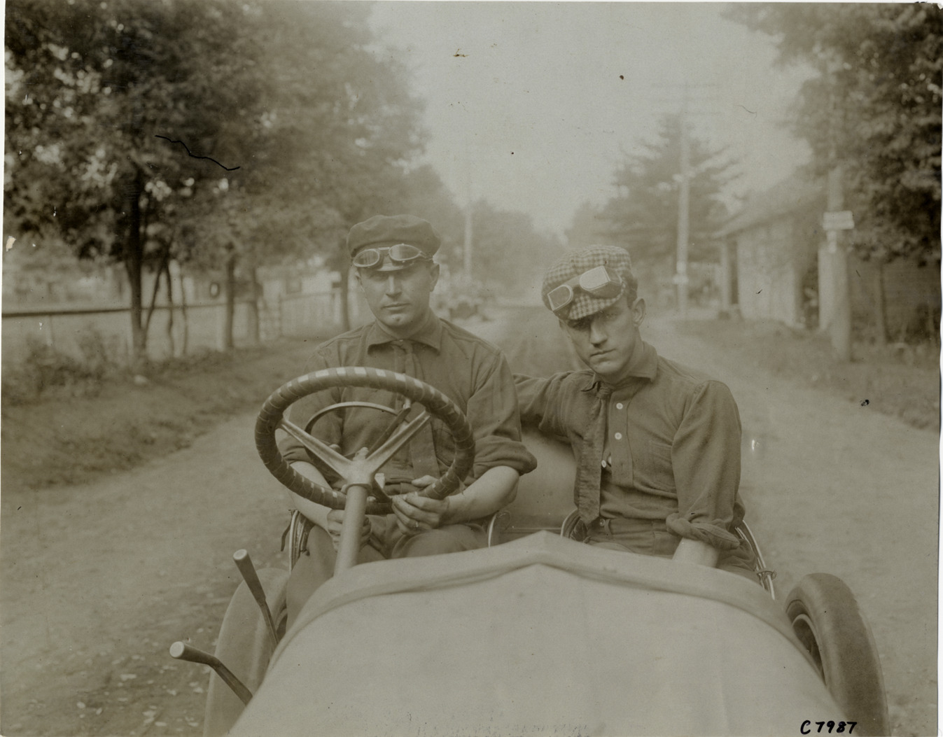View of driver Herbert H. Lytle and Bert Dingley in Pope-Toledo racecar. Handwritten on back: "Biography--Herbert Lytle. 1906 Vanderbilt Cup driver. Herbert Lytle, Bert Dingley, Pope."
