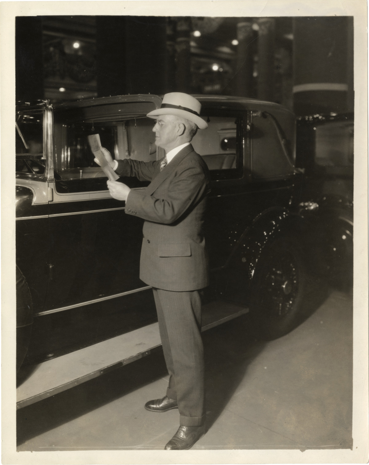 View of Alvan Macauley, standing in front of Rollston Cabriolet car at auto show. Stamped on back: "N. Lazarnick, commercial photographers, makers of industrial motion pictures, 1440 B'way (at 40th St.), N.Y., Tel. Chickering 1717. 5005 Euclid Ave., Cleve., Randolph 7852." Handwritten on back: "Biography--Macauley, Alvan. Alvan Macauley, president of Packard Motor Car Company of New York, reading [undecipherable] letter in front of Rollston Cabriolet at auto show."