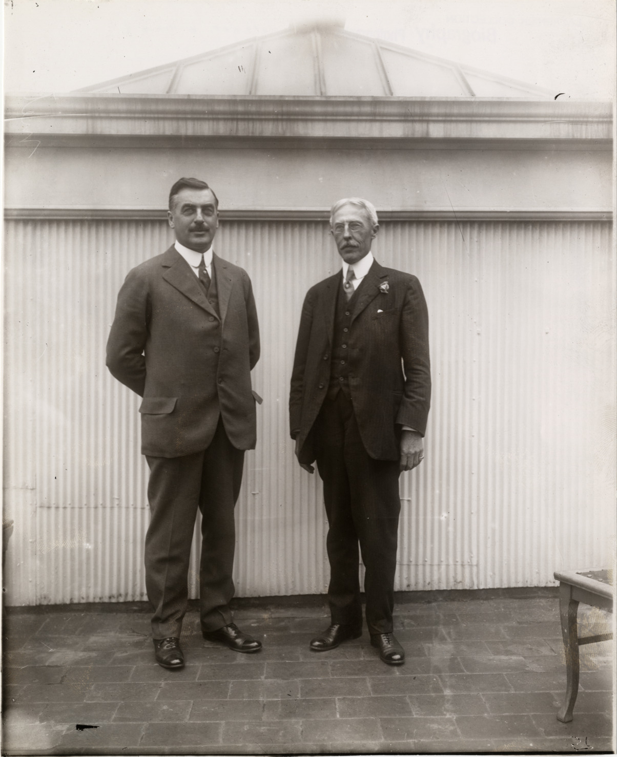 Portrait of William E. Metzger and unidentified man. Stamped on back: "Photographic illustration by Nick Lazarnick, 230 Park Ave., N.Y." Handwritten on back: "Biography--Metzger, William E. Wm. E. Metzger on left of E.M.F. Co. and first dealer in Detroit of Cadillac."