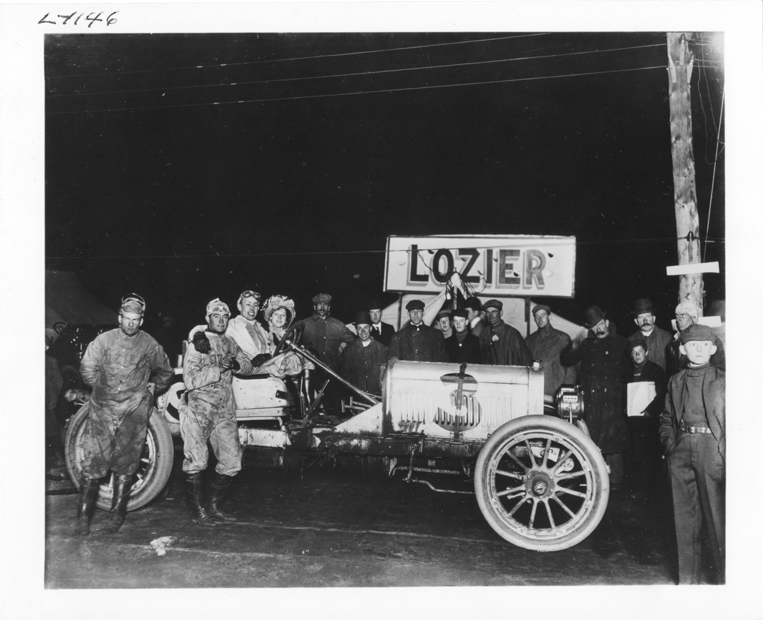 View of Ralph Mulford, sitting in Lozier racecar no. 3 at Brighton Beach 24 hour race. Mulford has his arm around co-driver Cyrus Patschke, standing next to car. Onlookers stand nearby; "Lozier" sign in background. Handwritten on back: "Biography--Mulford, Ralph. 6th Brighton Beach 24 hour race, October 15-16, 1909. Ralph Mulford and co-driver Cyrus Patschke won for Lozier setting new record of 1196 miles. Mulford has his arm around Patschke."
