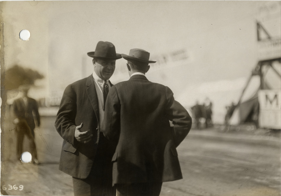 Barney Oldfield speaking with man at 1912 Vanderbilt Cup races