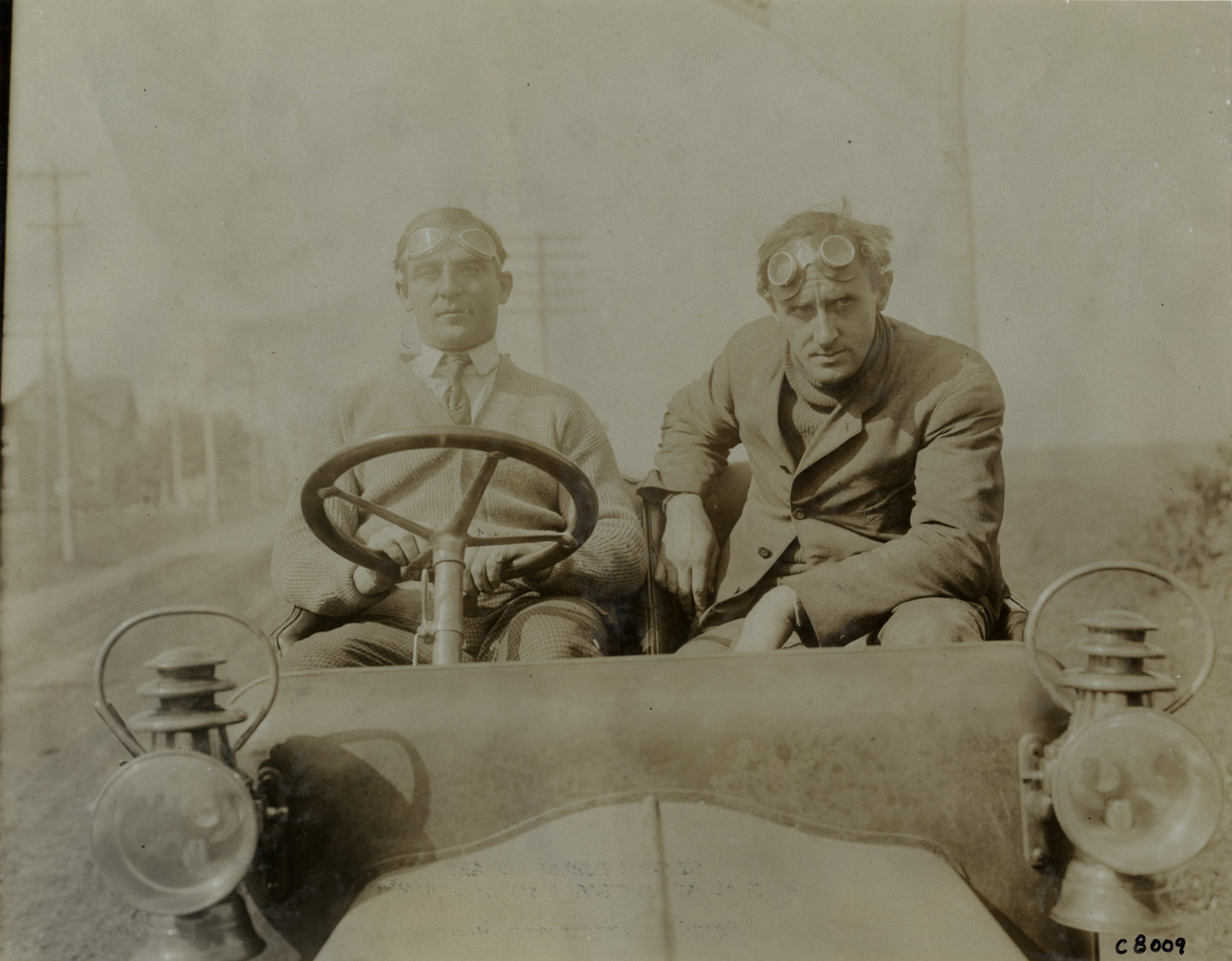 View of driver W.H. Owen and mechanic Fritz Offenhauser in car. Handwritten on back: "Biography--W.H. Owen, 1906 Vanderbilt Cup driver."