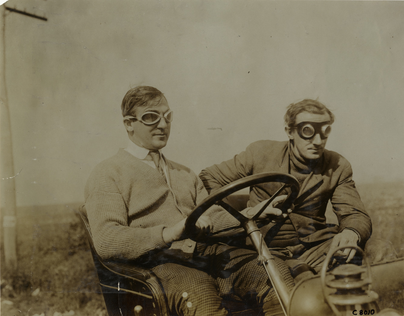 View of driver W.H. Owen and mechanic Fritz Offenhauser in car. Handwritten on back: "Biography--W.H. Owen, 1906 Vanderbilt Cup driver."