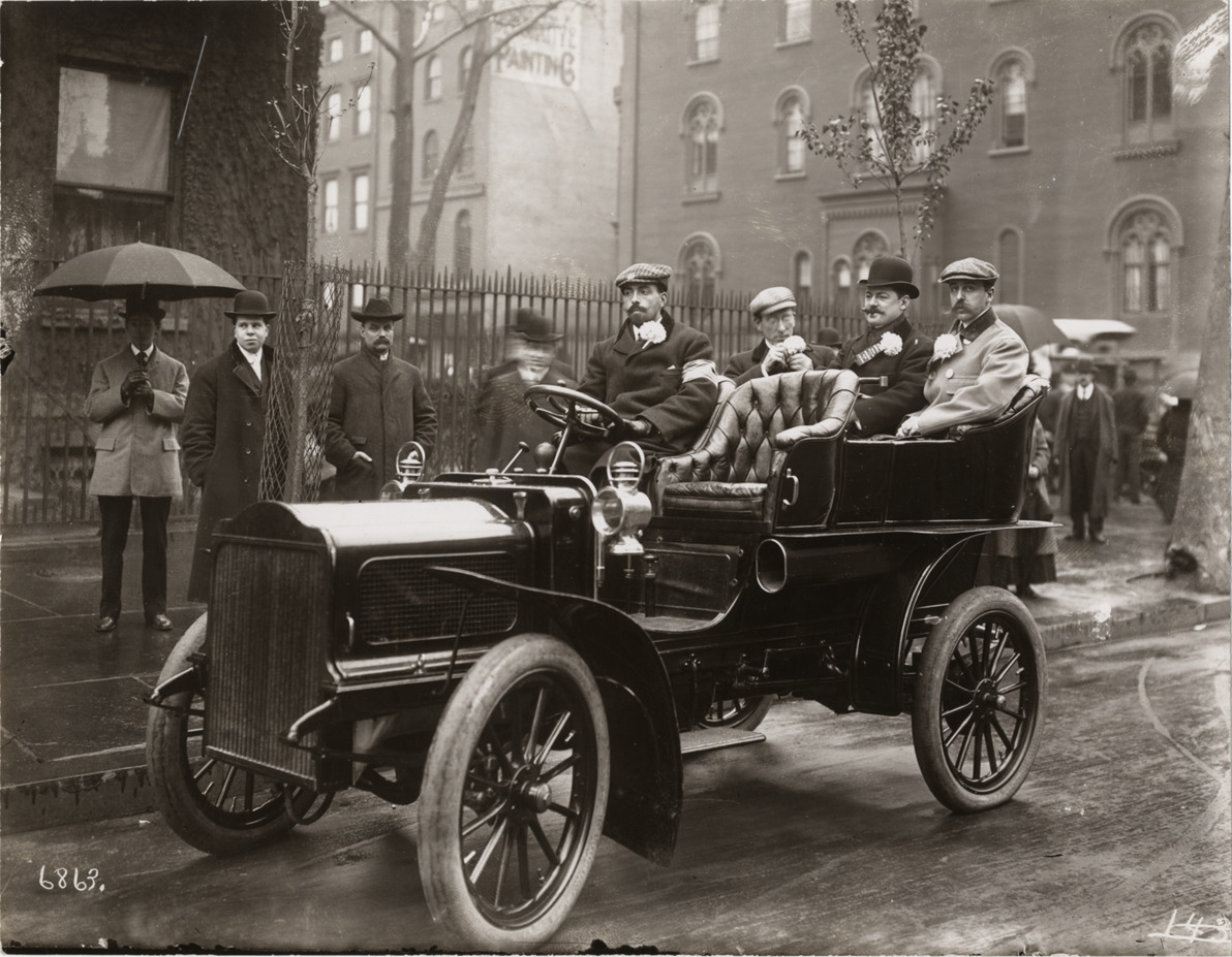 View of Augustus Post and passengers in White car, before a parade. Stamped on back: "Photographic illustration by Nick Lazarnick, 230 Park Ave., N.Y." Typed on back: "Persistent tourist. Decades before tenor James Melton took up antique car collecting, other singers discovered the publicity value in being identified with automobiles. At the wheel of the 1905 White Steamer above is Augustus Post, a Metropolitan Grand Opera singer, who figured prominently in most early cross-country tours. Here, however, he's lined up for a New York City parade, starting from Ninth Street and Fifth Avenue, next door to Mark Twain's home at 21 Fifth Avenue (right background). The man in the bowler hat is an unidentified Tammany politician, while at his left is Stanton Sickles, son of General Daniel E. Sickles of Civil War fame. Augustus Post today is a pillar in the Automobile Old Timers Club. He's still a motoring enthusiast, having led a revived Glidden Tour run from Detroit to Minneapolis in the summer of 1949." Handwritten on back: "Biography--Post, Augustus. Augustus Post at wheel in White Steamer."