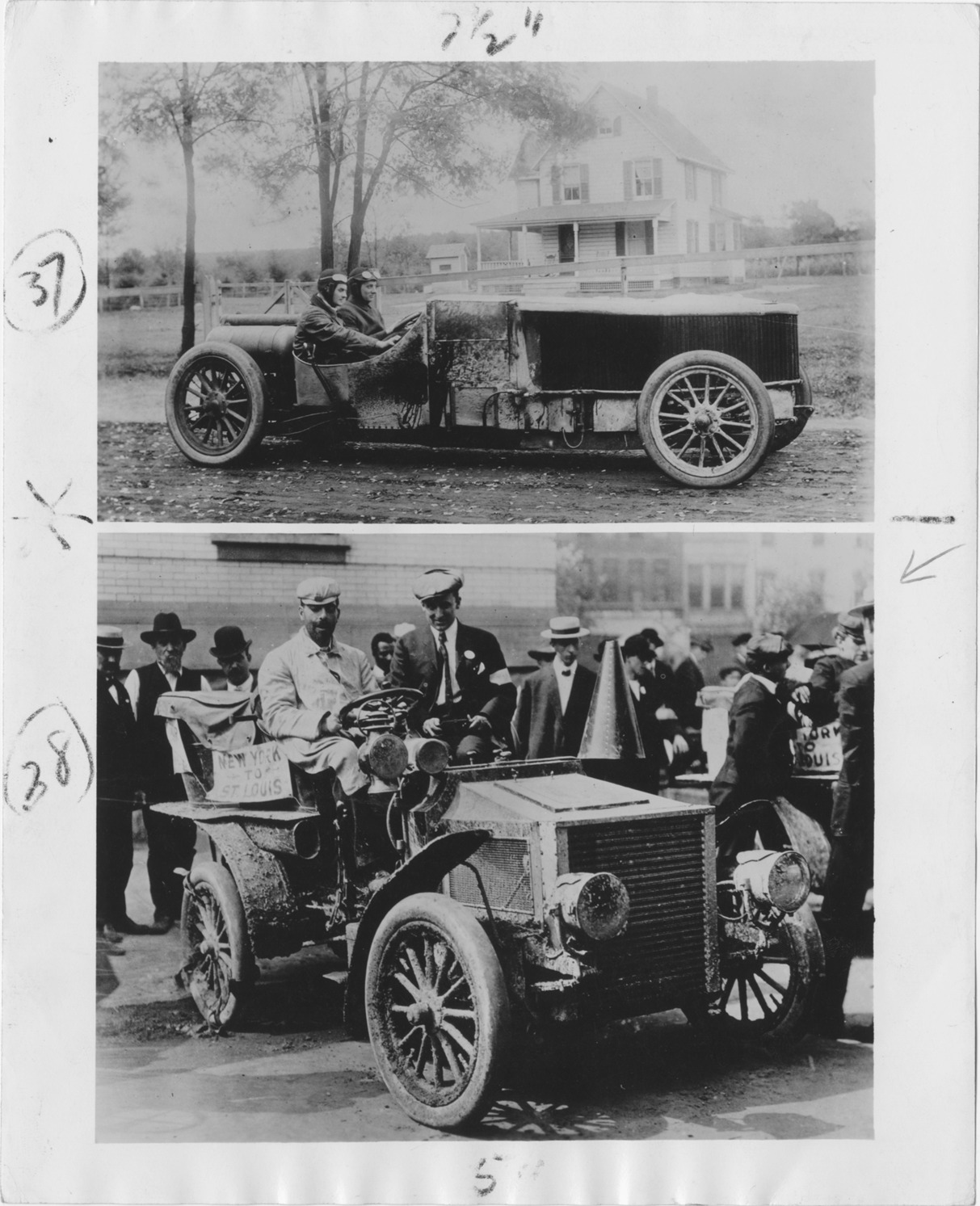 Two views of White cars. Top image shows Webb Jay driving White racecar, known as "Whistling Billy"; bottom image shows Augustus Post driving 1905 White steamer. Typed on back: "The famous White racer shown in this picture was known far and wide as 'Whistling Billy,' and its feats on the track back in the early part of the century were nothing short of amazing. This speedy steamer, with Webb Jay at the wheel, won the National Circuit Championship at Morris Park, New York, July 4, 1905, and lowered the world record for the mile to 48 3/5 seconds. Augustus Post, chairman of the Touring Committee of the American Automobile Association, at the wheel of his 1905 White steamer in the well-known New York to St. Louis tour which took place from July 25 to August 10, 1904. White's new 1905 model had just been introduced the previous month. Ten Whites were awarded certificates for successfully completing the tour in accordance with contest rules. Victories of the 10-horse power White over many competing vehicles of 24 horse power showed that the comparative speed of cars could not be determined on horse power alone." Handwritten on back: "Biography--Post, Augustus."