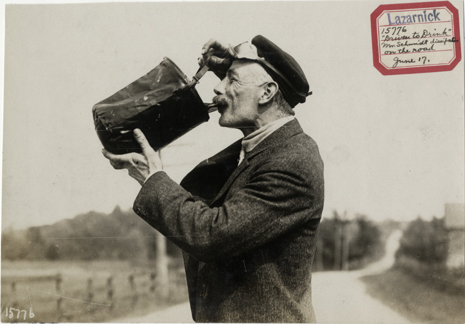 View of Mr. Schmidt drinking from canteen. Label on front: "Lazarnick. 'Driven to drink.' Mr. Schmidt dissipates on the road, June 17." Stamped on back: "Photo by N. Lazarnick, 29 West 42nd Street, New York." Handwritten on back: "Biography--Schmidt, 1907. Mr. Schmidt dissipates on the road, Monday, June 17."