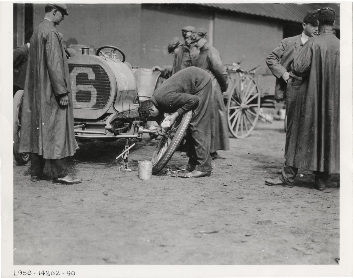 Favorite this☆ E.F. Shepard repairing tire of Hotchkiss racecar Description: View of E.F. Shepard repairing tire of Hotchkiss racecar no. 6 at Vanderbilt Cup race. Typed on back: "Elliot Shepard in a Hotchkiss at Vanderbilt, 1906." Handwritten on back: "Biography--Shepard, E.F." Details Resource ID: na004216 Subject: Automobile racing drivers Automobiles, Racing Hotchkiss automobile Automobiles--Tires--Maintenance and repair Vanderbilt Cup Race (1906) Photographic prints Date Issued: 1906 Format: 1 photographic print ; 8 x 10 in. Member of: National Automotive History Collection Lazarnick Collection Filing Location: Biography--Shepard, E.F. Rights: Physical rights are retained by DPL. Copyright is retained in accordance with U.S. copyright laws.