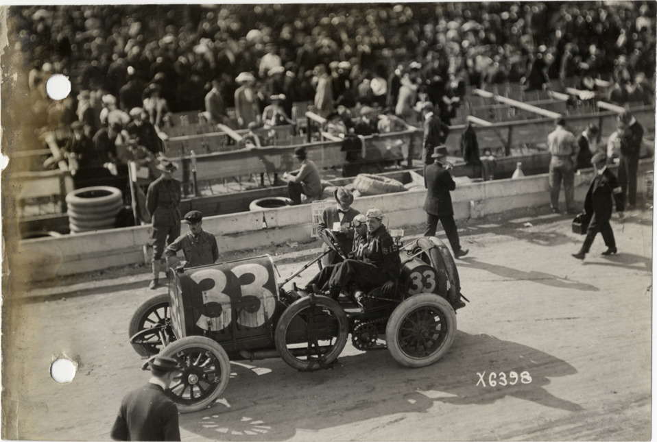 View of Teddy Tetzlaff in Fiat racecar during the 1912 Vanderbilt Cup races. Stamped on back: "Spooner & Wells, Inc., photographers, 1231 Woodward Ave., Detroit, Mich., telephone North 1745." Handwritten on back: "Biography--Tetzlaff, Teddy. Teddy Tetzlaff starting race, Fiat, Vanderbilt, Oct. 1912."