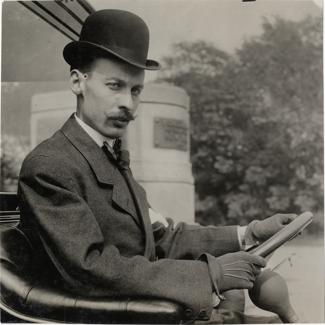 View of C.A. Towson driving car. Stamped on back: "F. Ed. Spooner, and Chas. S. Wells. Motor News, Motor Photos, Motor Adv, 1536 B'way, New York. Tel 6536-38th St." Handwritten on back: "Biography--Towson, C.A., 1906."