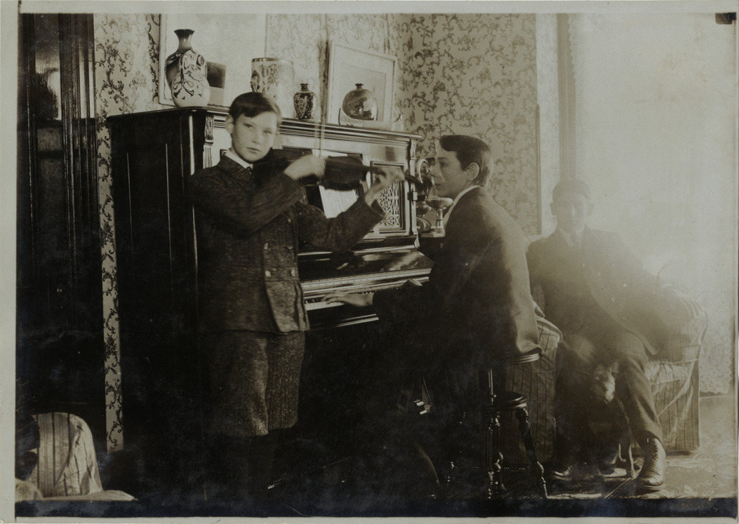 Favorite this☆ Boy playing violin Description: View of boy playing violin accompanied by teenage boy playing piano. Man sits in chair in background, with dog sitting at his feet. Handwritten on back: "Biography--Unidentified." Details Resource ID: na004252 Subject: Violinists Pianists Piano Dogs Photographic prints Date Issued: Unknown year Format: 1 photographic print ; 5 x 7 in. Member of: National Automotive History Collection Lazarnick Collection Filing Location: Biography--Unidentified #1 Rights: Physical rights are retained by DPL. Copyright is retained in accordance with U.S. copyright laws.