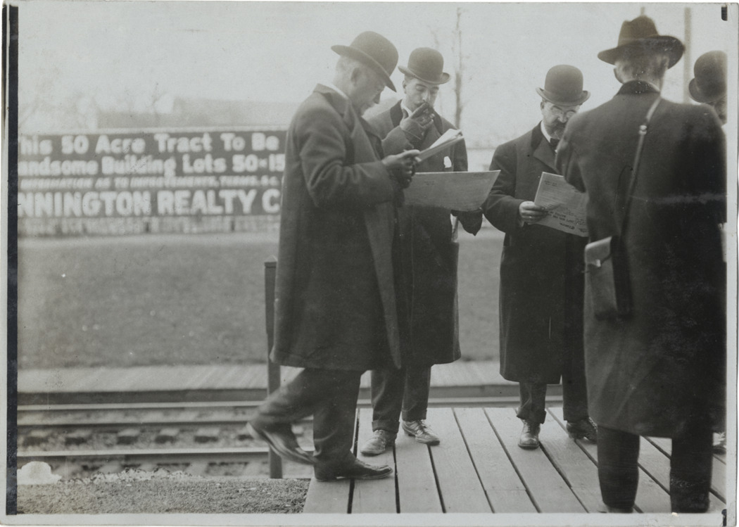 Favorite this☆ Men standing on railway platform Description: View of men standing on platform at railroad station; some men are reading, others smoking. Railroad tracks in background. Handwritten on back: "Biography--Unidentified." Details Resource ID: na004273 Subject: Men Photographic prints Date Issued: Unknown year Format: 1 photographic print ; 5 x 7 in. Member of: National Automotive History Collection Lazarnick Collection Filing Location: Biography--Unidentified #1 Rights: Physical rights are retained by DPL. Copyright is retained in accordance with U.S. copyright laws.
